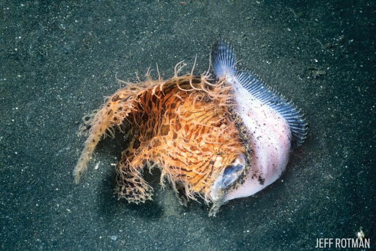 13) Striated, or hairy, frogfishes usually mimic algae or soft corals, but can occasionally mimic venomous black urchins.