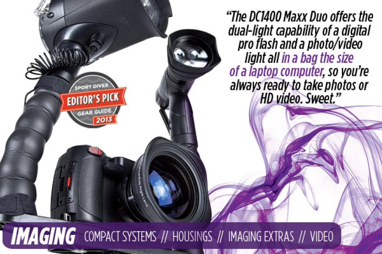 Carrie GarciaThe DC1400 Maxx Duo combines a 14-megapixel camera, fisheye wide-angle lens, flash, video light and tray (and a host of accessories), so you’ll never get caught choosing between shooting cool video or photos again.