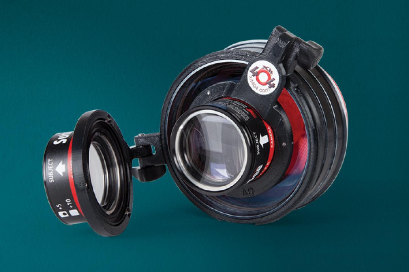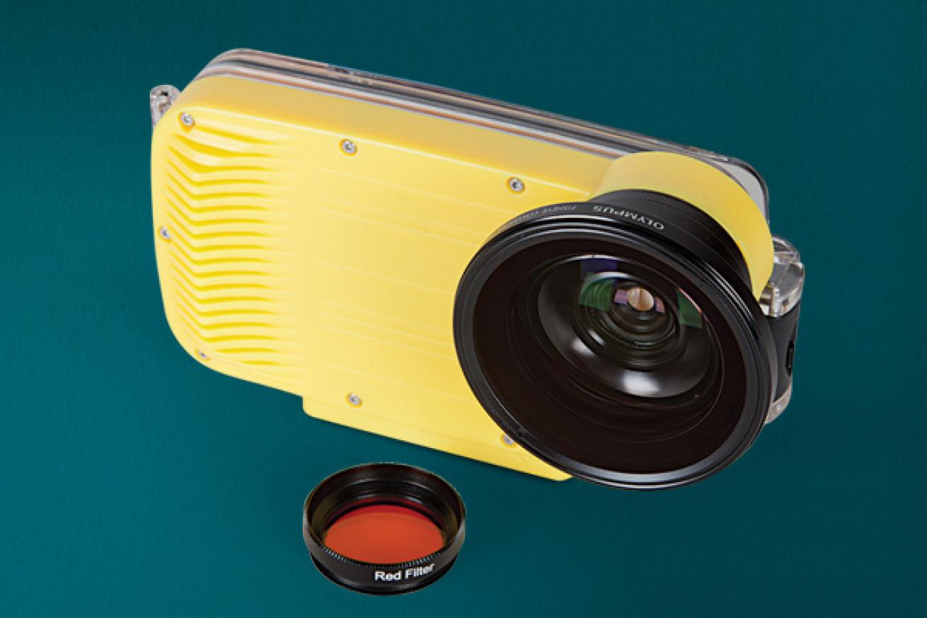 Carrie GarciaWatershot’s Olympus fisheye lens allows for more creativity, while the red filter enhances warm reds and oranges in tropical blue water. Both can be installed and removed underwater.