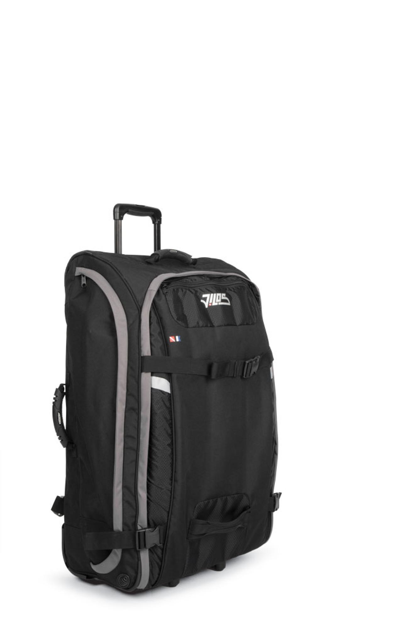 Rugged tarpaulin exterior with reinforced bottom and wheeled frame.Full-length side pockets big enough to fit even XL fins.