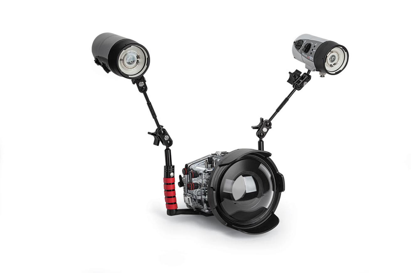 Ikelite's corrosion-proof clear polycarbonate housing features proprietary circuitry linking camera and strobes for correct exposure. The strobes' light Li-ion batteries provide 450 flashes per change and recycle instantly.