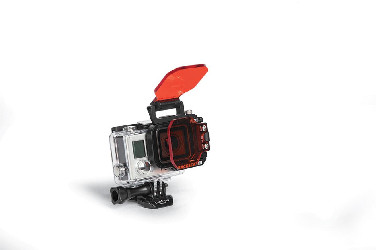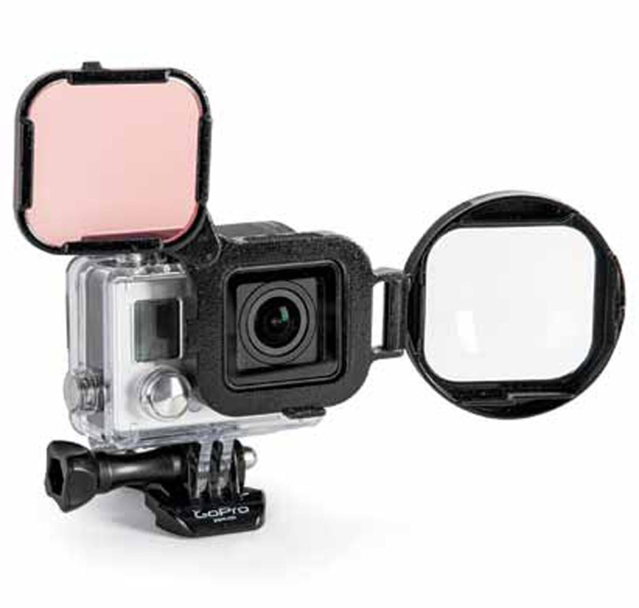 The Switchblade installs easily on GoPro’s Hero3 or Hero3+ and lets you swap the color-correcting filter and 2.2x macro lens while underwater. Filter and lens swing out of the way, so you can choose filter only, macro only, filter and macro, or neither.
