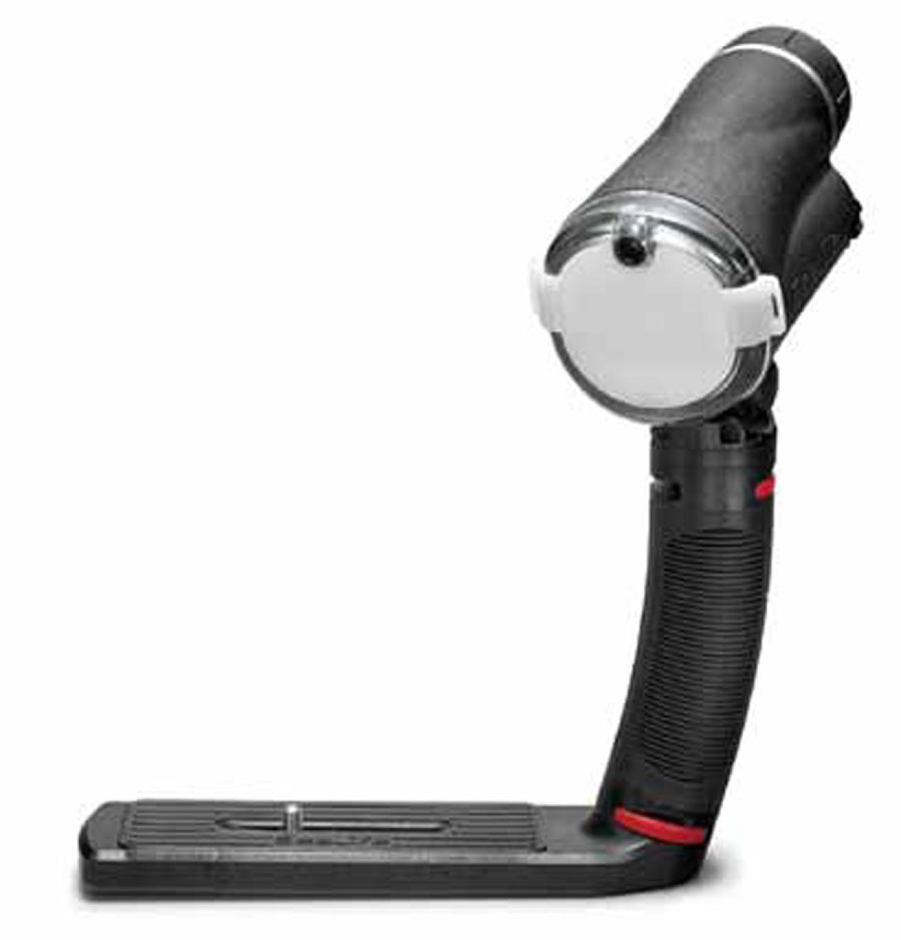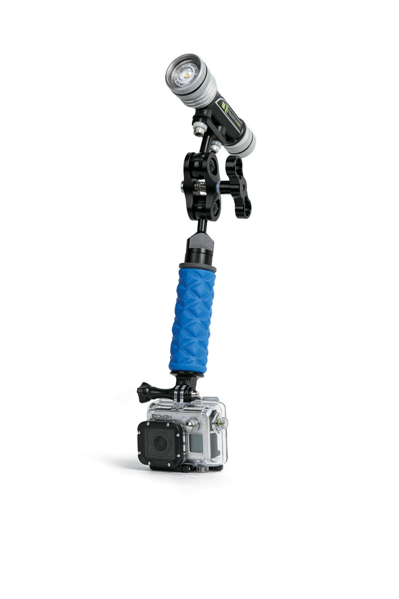 Ultralight’s Pistol Grip is compact, handy and simple — just attach your GoPro on one side, and your video light on the other. Made of aluminum, the Pistol Grip is rubber padded for nonslip comfort, and it quickly folds up to slip into a BC pocket.