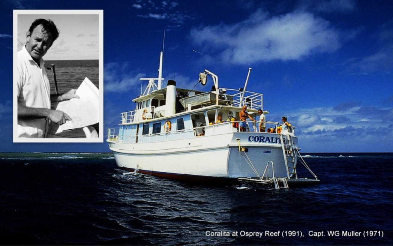 Captain Wally Muller was a long-time fisherman, who explored reefs in the Great Barrier Reef’s Swain sector and the distant oceanic Coral Sea atolls which other captains avoided. Many of those areas were uncharted, and considered too dangerous to enter. Muller fished commercially, then later took out fishing parties for several years aboard his first boat, Riversong.