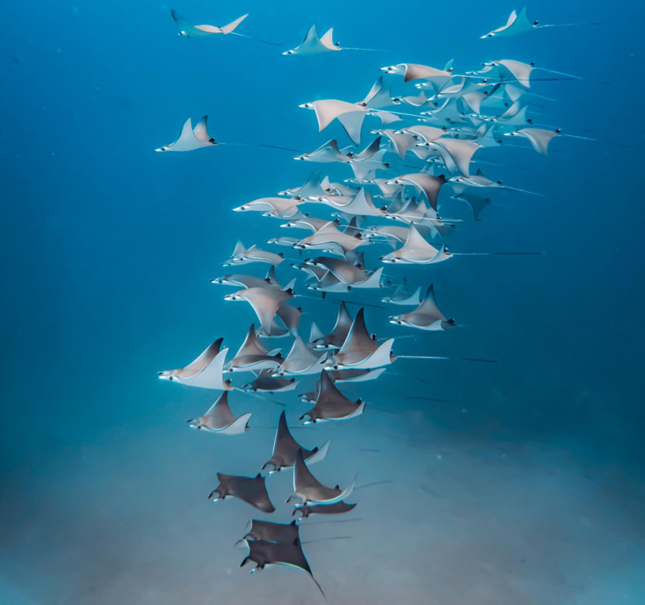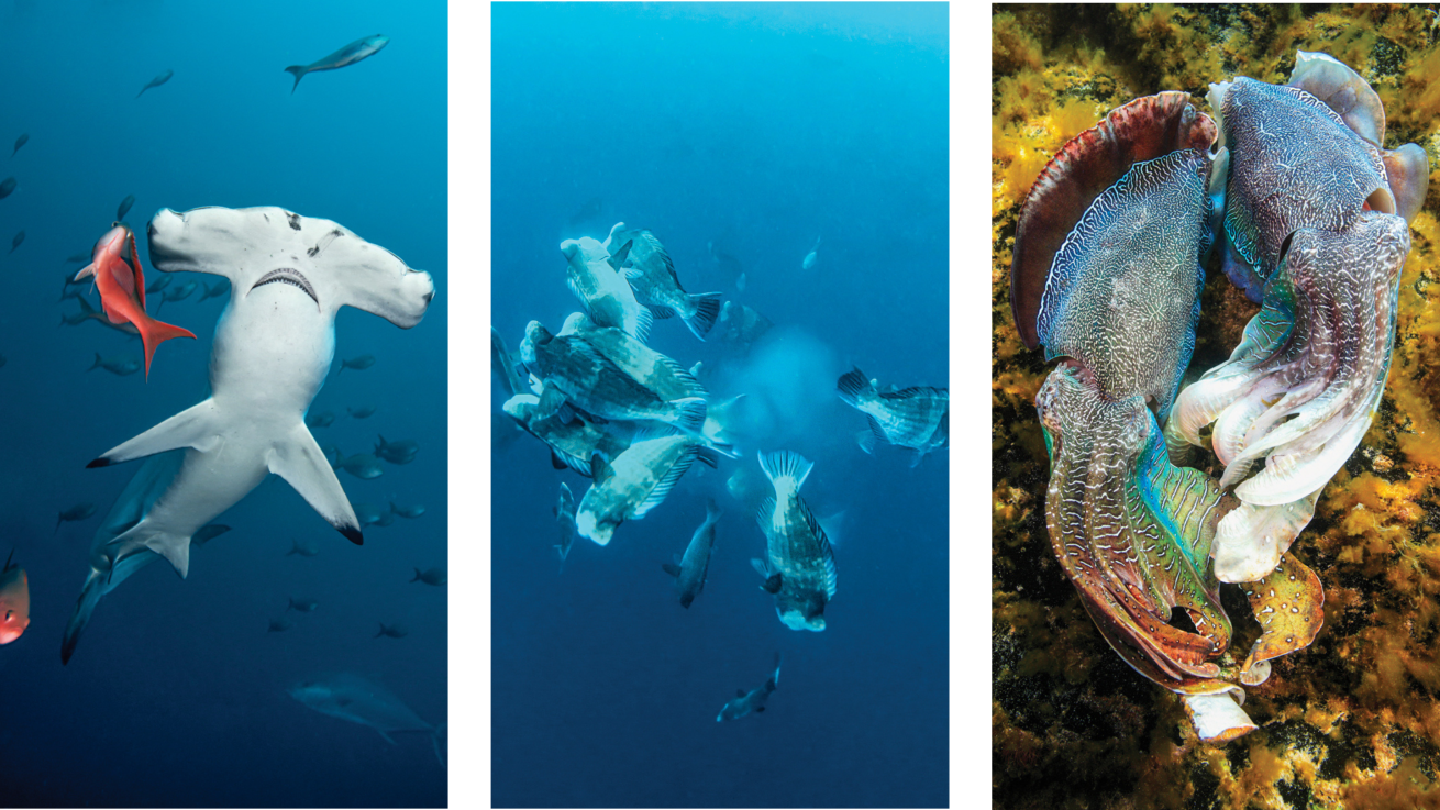 Tanya Burnett; Stephen Wong; Brandon ColeFrom left: A school of hammerheads, bumphead parrotfish spawning and cuttlefish mating.