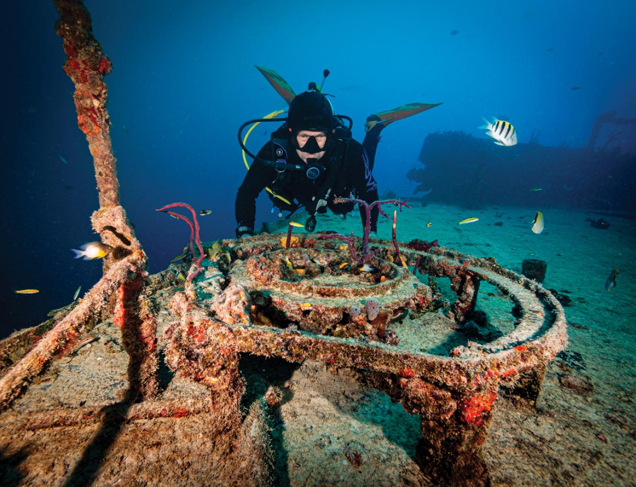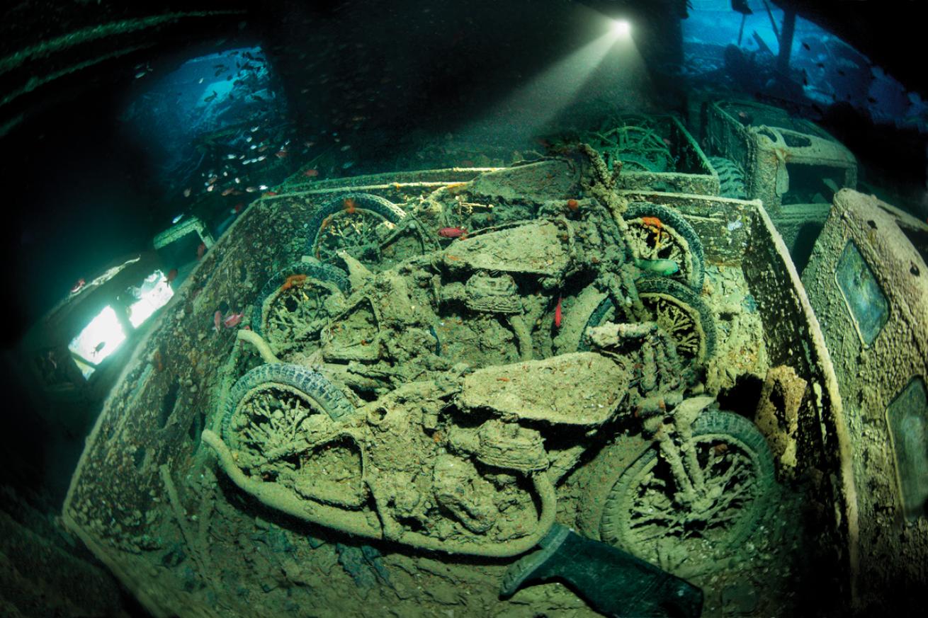 The Thistlegorm engine was decimated when the ship sank and isn’t part of the tour, but the real highlights at this iconic site are the rooms upon rooms of wartime cargo, from Bedford trucks and motorcycles to Enfield rifles in racks and tires and rubber boots in crates. The experience is unforgettable, made even more memorable if done as a night dive, which liveaboards such as Red Sea Aggressor II can offer.