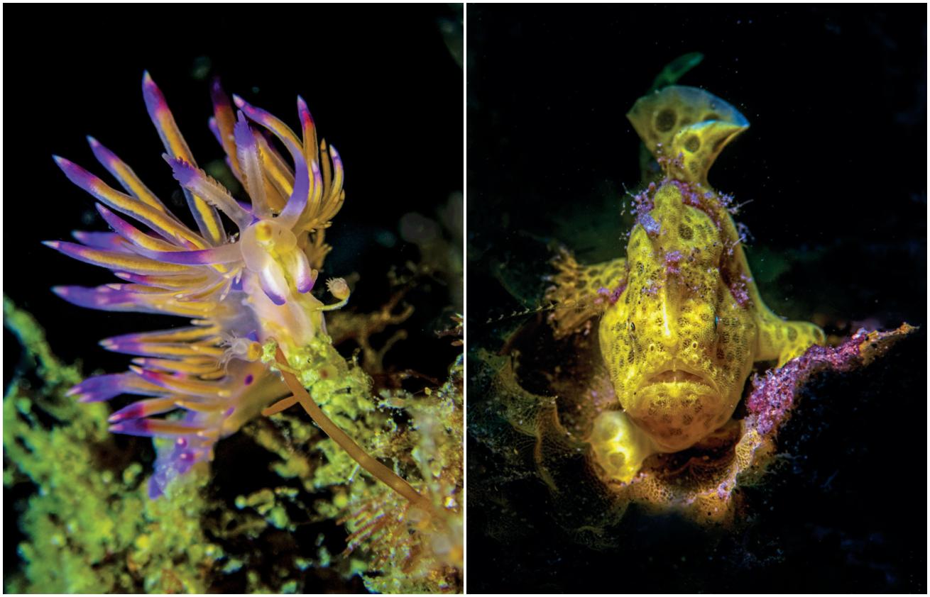 Gerald NowakFrom left: A nudibranch and a painted frogfish practice color coordination in Dauin, Philippines.