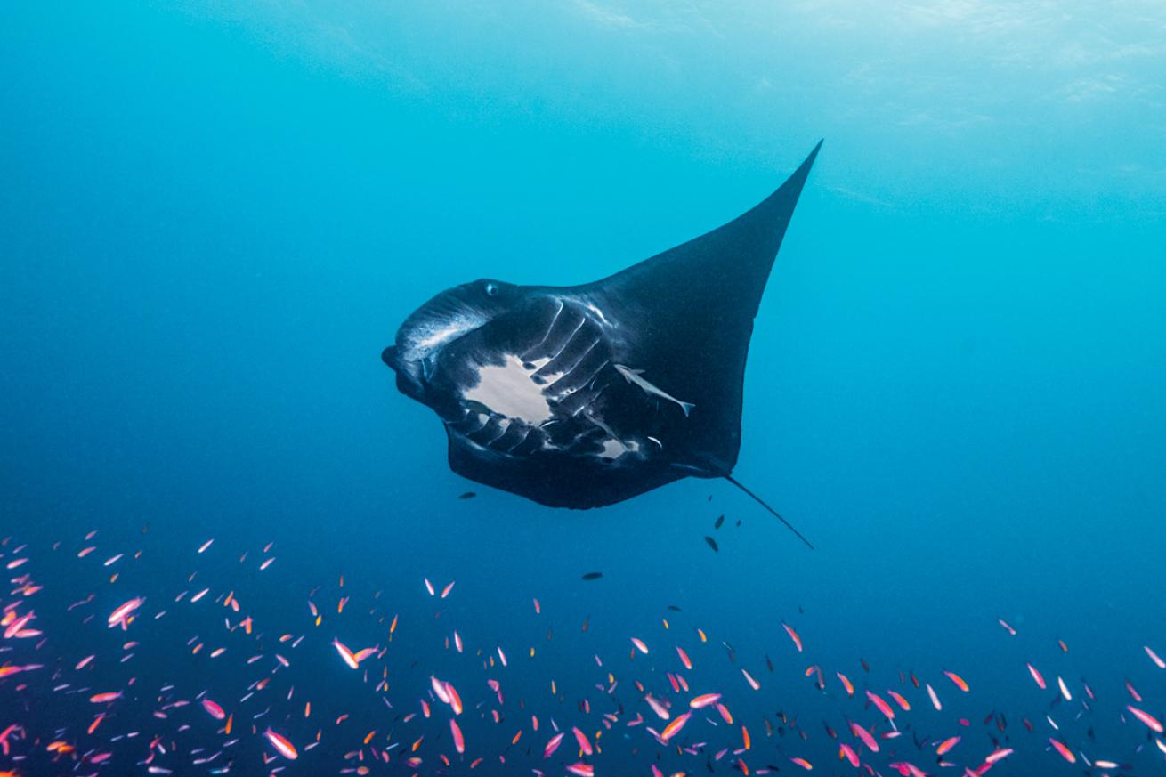 “We had a guest who was so head over heels with mantas,” says Miriam Staiger, Manta Trust Laamu project manager. “She really hit the jackpot as we had 11 manta rays at the cleaning station for the entire dive— she had 65 minutes of pure manta magic.”