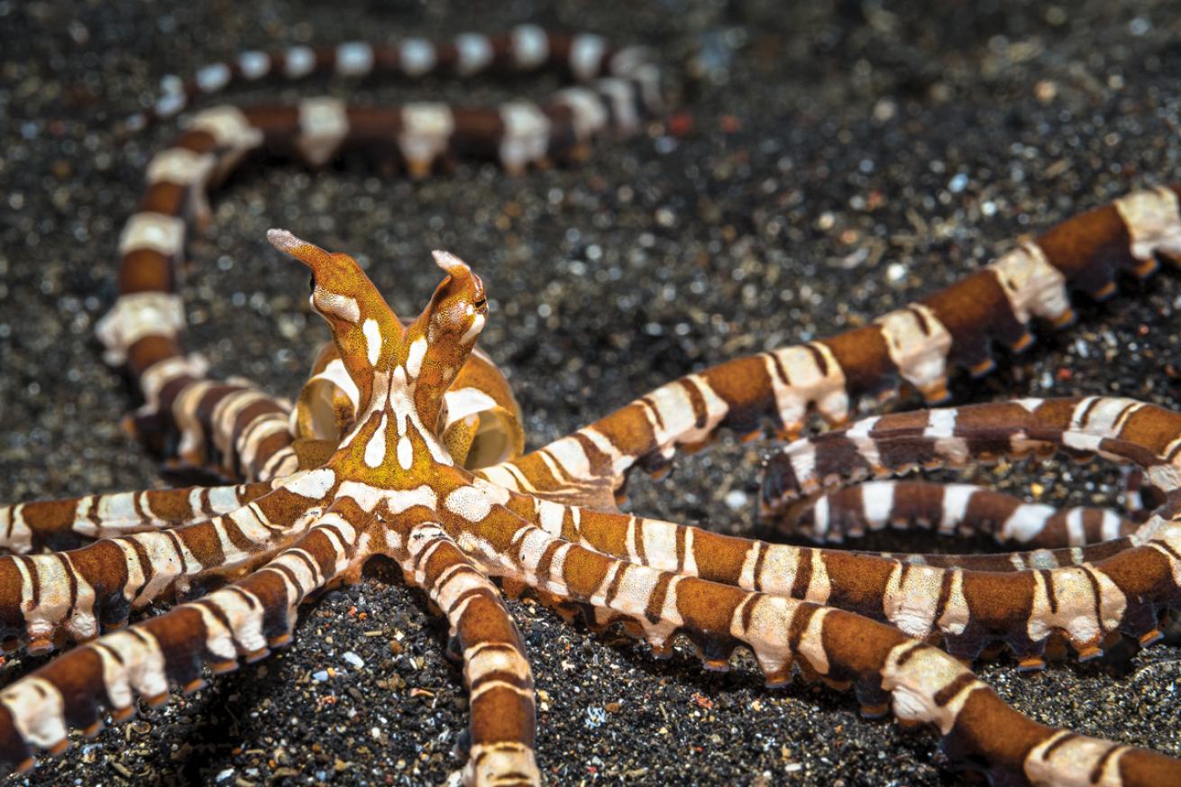 Jennifer PennerA wunderpus octopus on the black sands of Lembeh Strait, Indonesia