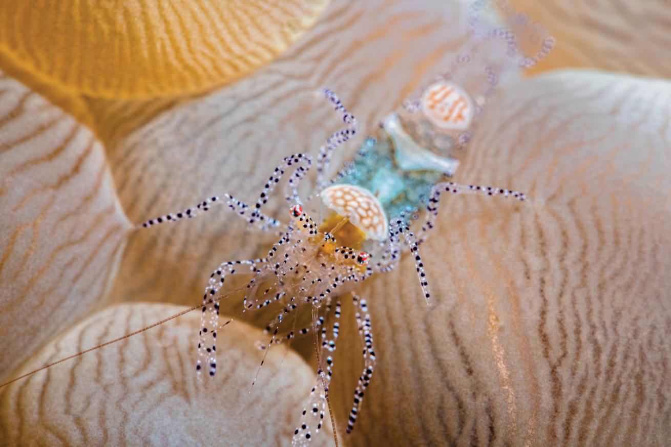 Jennifer PennerA tiny shrimp perches atop bubble coral.
