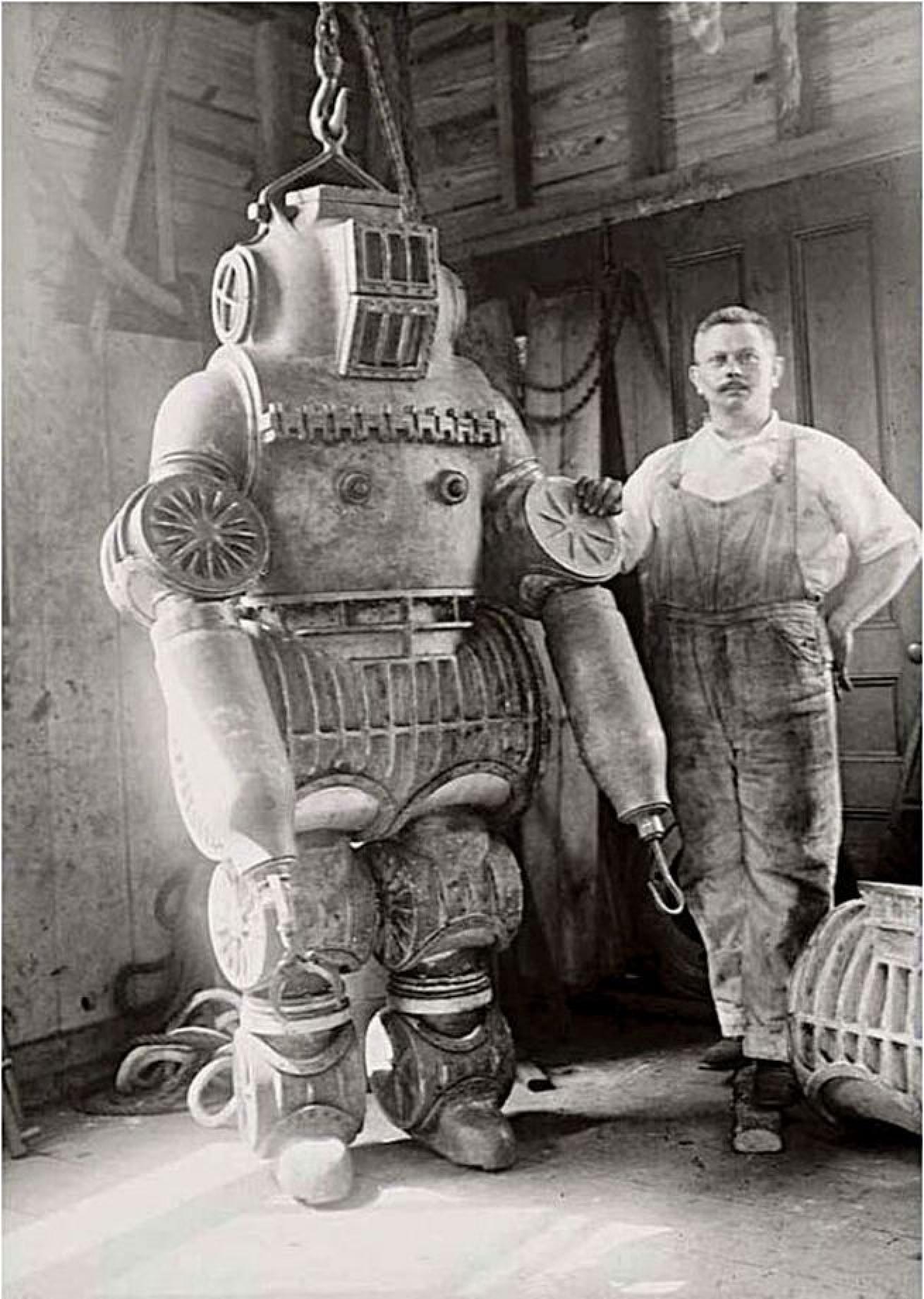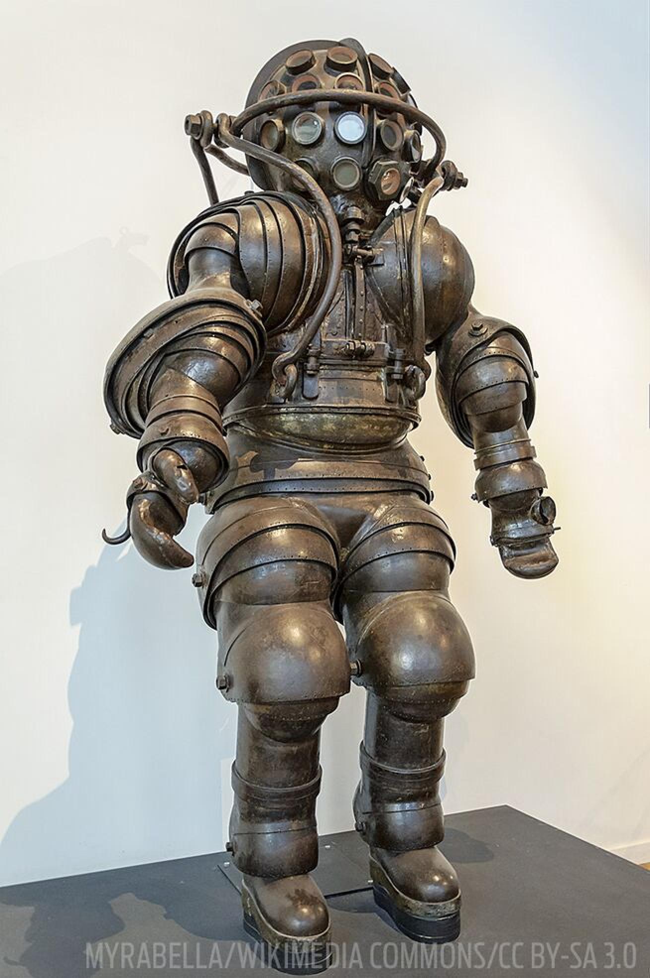 Four hundred eighty pounds — that’s how much this 1910 first version of a metal diving suit weighed. And yet, this aluminum-alloy invention succeeded in carrying a diver to 212 feet in Long Island Sound. To modern divers, this container, a collection of joined barrels covering and supporting the limbs and joints, seems like a costume from a 1950s underwater sci-fi show.
