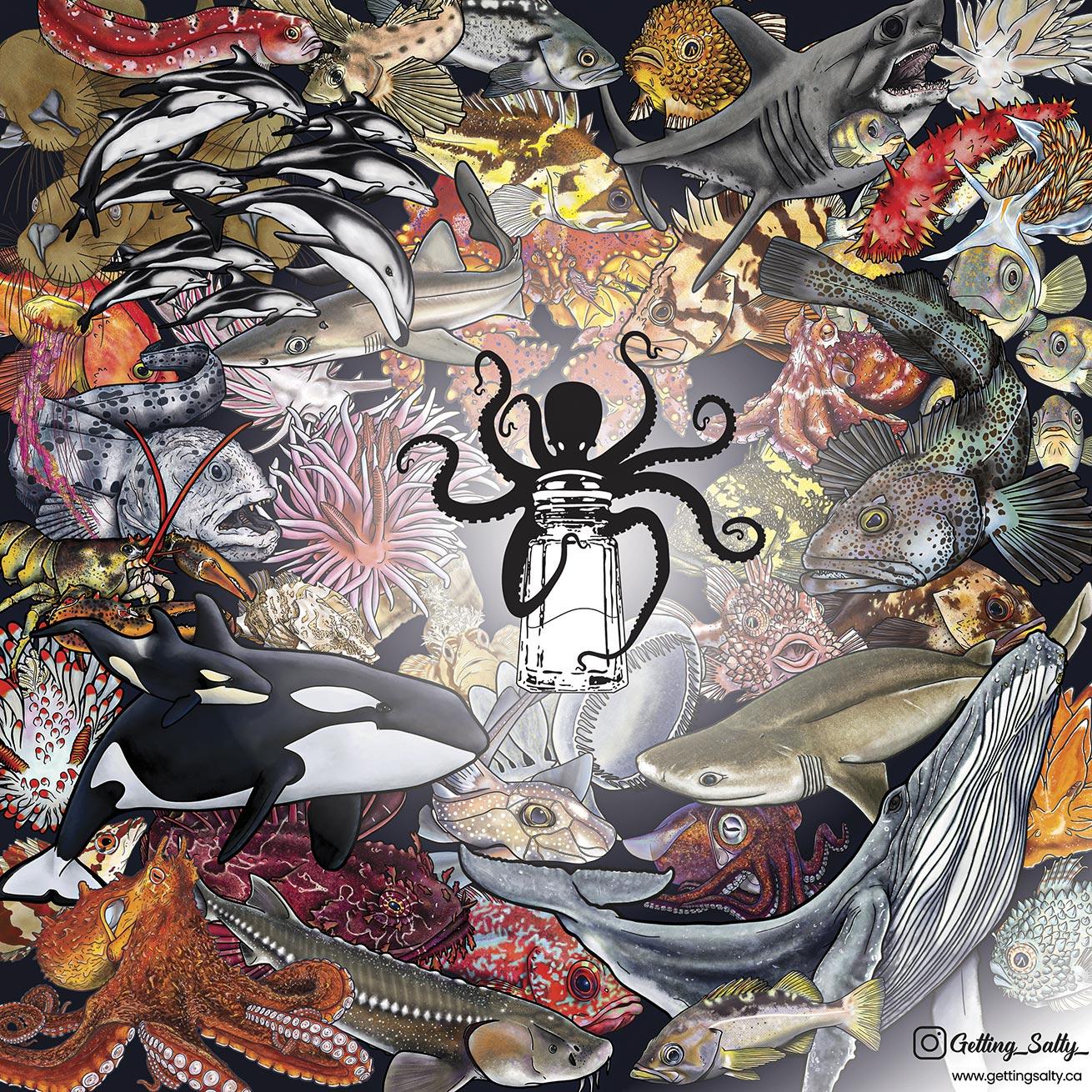 Kolin Hansen, a cold-water diver and artist from Vancouver Island, harnesses his 3D animation skills to spotlight the often-overlooked marine life of the Pacific Northwest. Certified as a scuba diver since 2012, Kolin’s artistic focus is on the unique species found in colder waters, diverging from the typical tropical subjects seen in mainstream marine art. His digitally hand-painted portraits vividly capture the essence of local marine life like rockfish, wolf eels and the giant Pacific octopus.