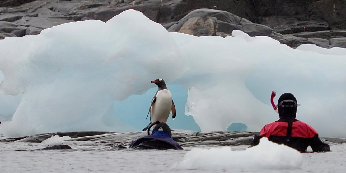 Carol Cotton BlickenstorferGentoo Penguins and two snorkelers at Point Pockroy, February 28, 2024.