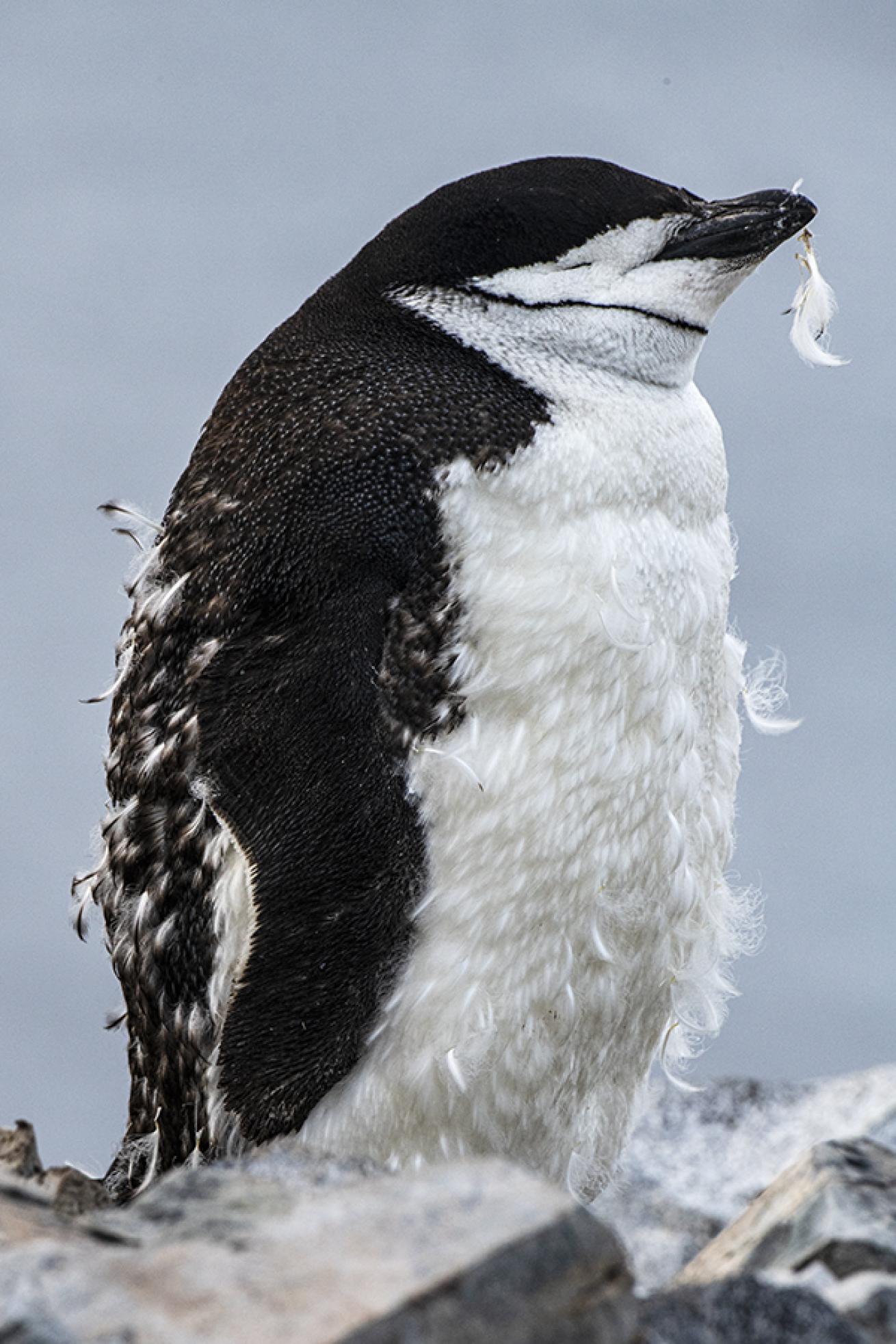 Courtesy Virginia BriaJuvenile chinstrap penguin molting at Orne Harbor.