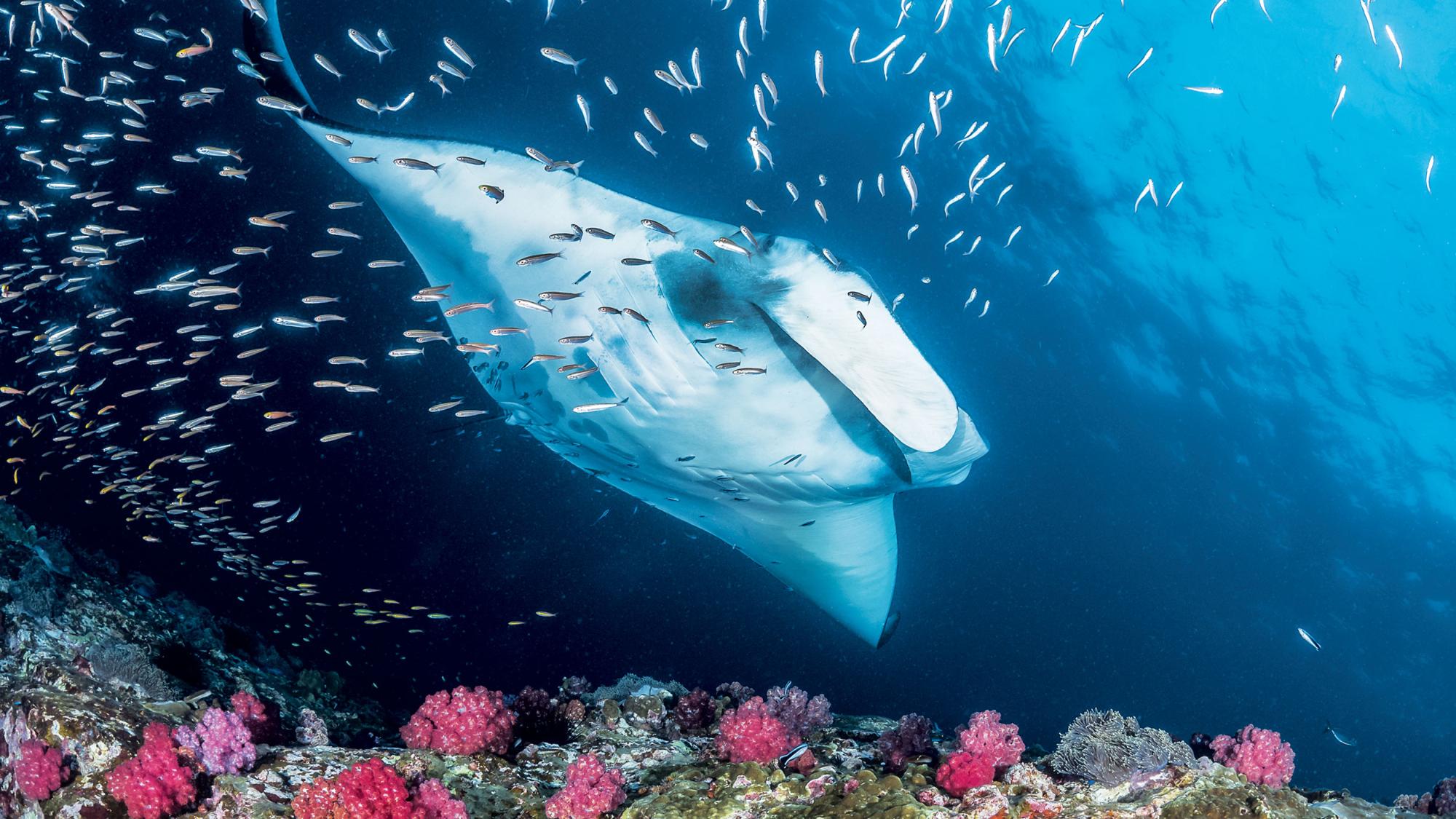 On the first dive of the day, we head to the northwest side of the island, where soft corals abound in vibrant magenta, lavender and yellow hues. When we reach the tip of the ridge, I gesture for my buddy to model for me. As he hovers above the expanse of soft corals while I dial in my exposure, I notice a dark shadow appear from behind. A manta ray flies right over my model a few seconds later, confirming our suspicion about this site. That day we dive here two more times, first with a group of divers mapping the site, and then a sunset dive, when the current picks up, causing an upwelling of colder nutrient-rich water that kick-starts the action, bringing out thousands of damselfish to feed and, in turn, attracting predators with schools of big-eye trevally racing back and forth.