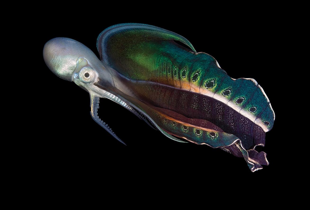 Behind the Shot It is always exciting to see argonauts riding other creatures. This one was about 3 centimeters tall and was scooting around slowly enough for me to turn the camera vertically and get close. They will usually turn away from light and motion, so using a red focus light allowed me to swim alongside the pair to get some good images, even though the strobe firing startled the argonaut each time. There is some discussion on the reason for the behavior here, but it seems to me like when you live in the open water, a ride on a jellyfish would be quite nice.