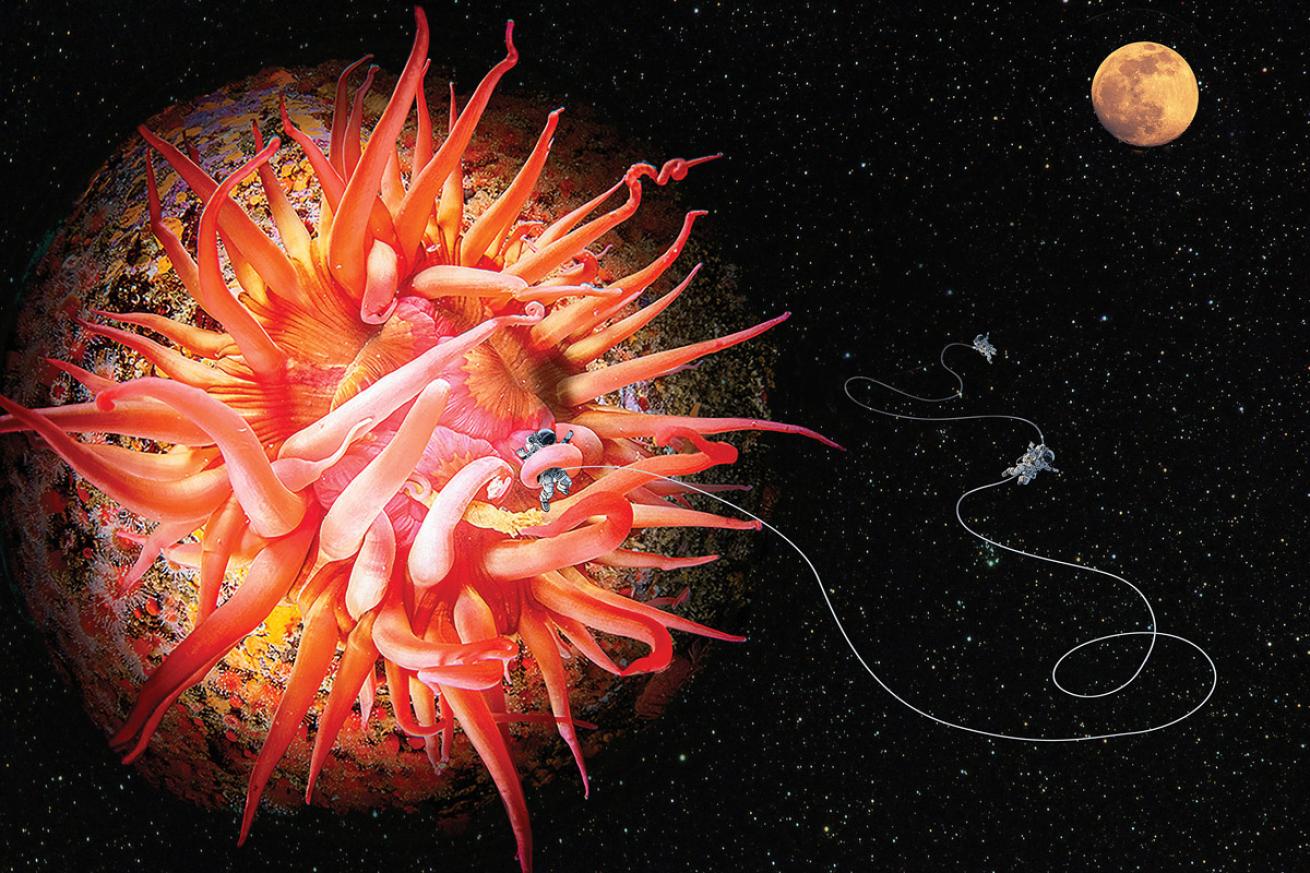 Behind the Shot I was shooting circular images and I found this anemone. It was on a rock, and it was perfect for a circular image. At 8mm I had to get really close and took several shots. When I returned home and viewed the photo, I thought it looked like an alien planet with tentacles. Astronauts being swallowed up after losing contact with their mothership seems a bit creepy, but in the end a great way to have an alternate view of a common subject.