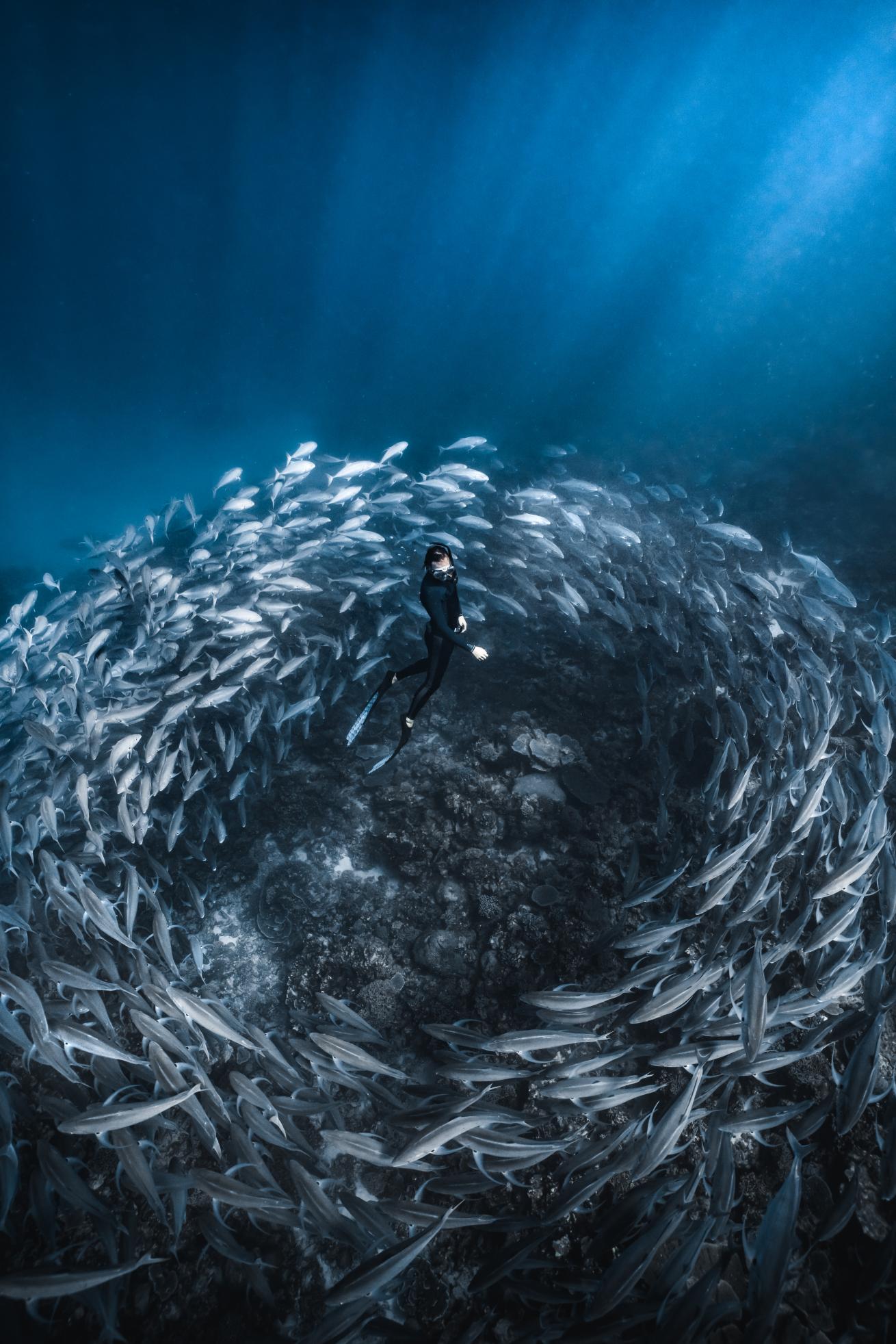 Behind the Shot While out freediving one of our local sites, my friend Jackson Stutsel and I came across the biggest school of gold-spot trevally that I’ve ever seen. As he dived down closer, the trevally began to circle him inquisitively. I was in the perfect spot to capture the scene as it unfolded.