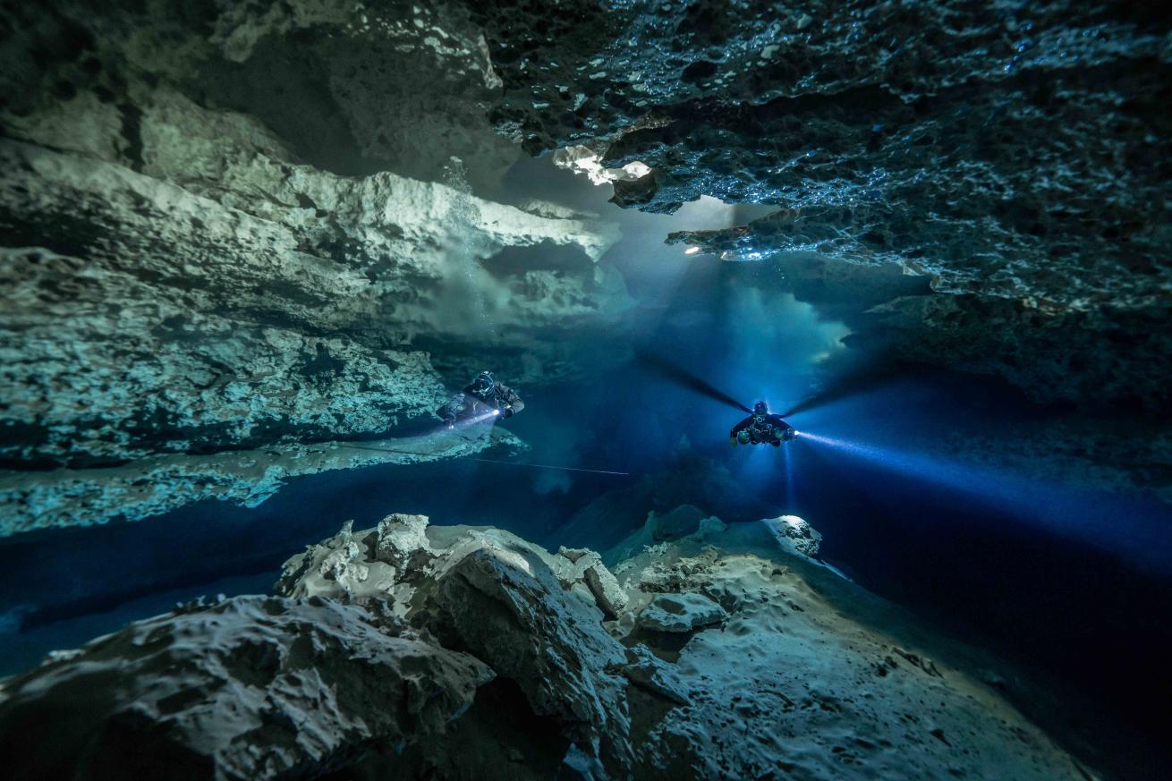 Behind the Shot Mayan Blue is one of the most striking caves for its huge tunnels and crystal-clear waters. On this day, the stars aligned and I could finally dive with Fran Lopez and Chema Sánchez Pérez, of Go Dive Mexico, and Benjamín Ramiro Ríos helping out with lighting—something we had been trying to organize for quite a while. We used DPVs to navigate Mayan Blue A tunnel and reach the Dead Arrow Passage, where this photo was taken. We wanted to have more time to light the tunnel and try a shot with two divers but only one assistant for a backlit shot. It worked out, and a lot of fun was had by all—the main reason we dive.