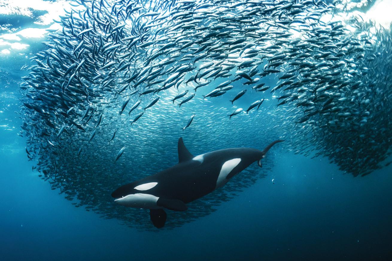 Behind the Shot Every winter, enormous schools of herring migrate from the open ocean into the fjords of northern Norway and attract large numbers of big predators such as orcas and humpback whales. Witnessing orcas feeding on herring using the so-called carousel feeding technique is very exciting but not easy to capture due to various factors: limited light and visibility, fast-paced action, and cold surface and water temperatures. Being able to freedive and capture the action on an ongoing feeding frenzy in these conditions is difficult, but this winter I managed to create this special photo of a female orca splitting a herring baitball while diving through it to get one fish.