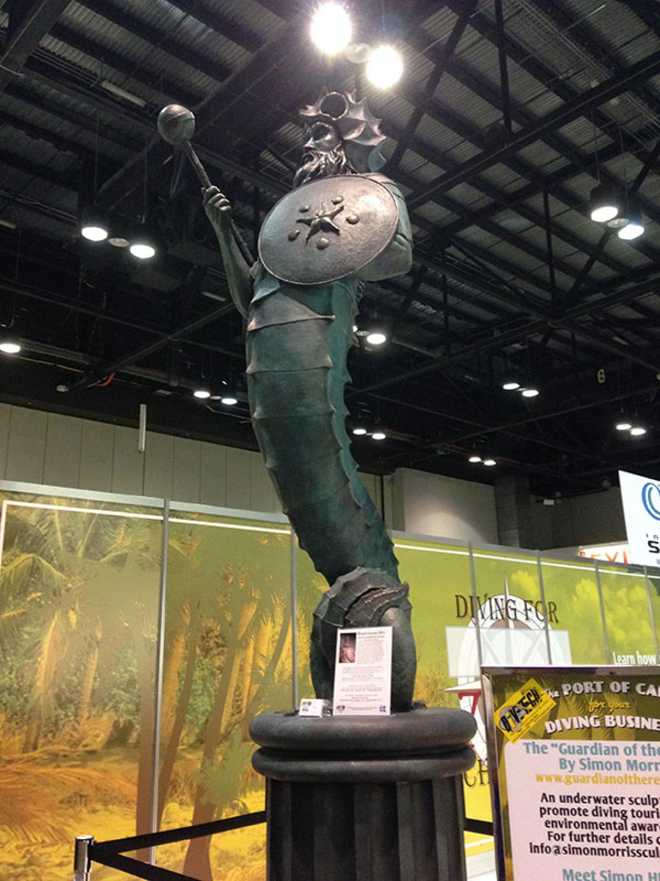 The Easterbrooks and artist Simon Morris unveiled the statue and their plans for its sinking at DEMA in November 2013. Scuba Diving magazine was on hand for the announcement. Scuba Diving was also at the sinking of the 1,100-pound statue.