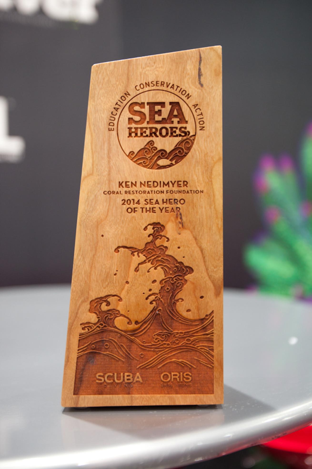 The Sea Hero of the Year award, presented to Coral Restoration Foundation's Ken Nedimyer at the 2014 DEMA Show, designed by Mike Witt.