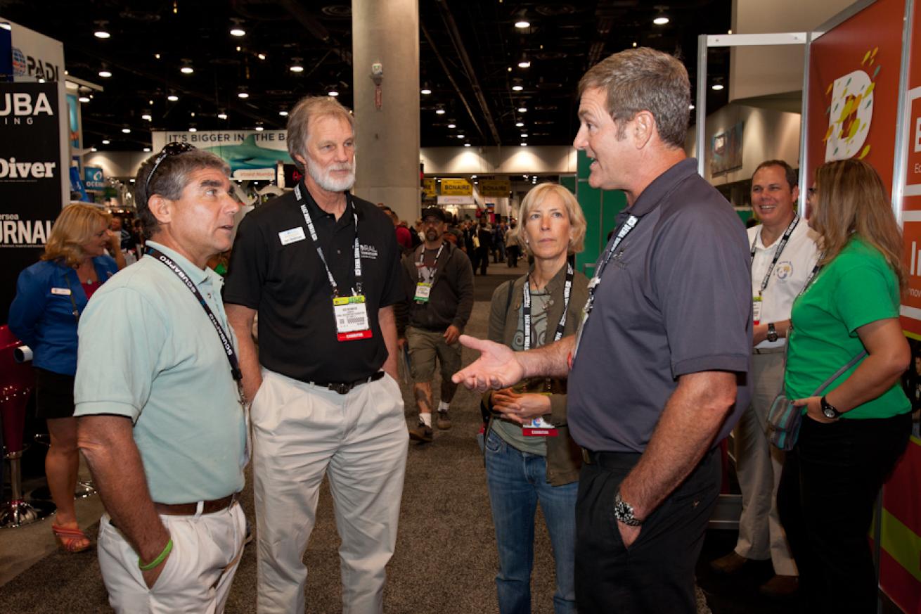 Scuba Diving Magazine's 2014 Sea Heroes at the DEMA Show: from left, Lad Akins, REEF Reef Environmental Education Foundation; Ken Nedimyer, Coral Restoration Foundation; Mary O'Malley, WildAid; and Keller Laros, Manta Pacific Research Foundation. (Not pictured: Carrie Manfrino, CCMI - Central Caribbean Marine Institute.)
