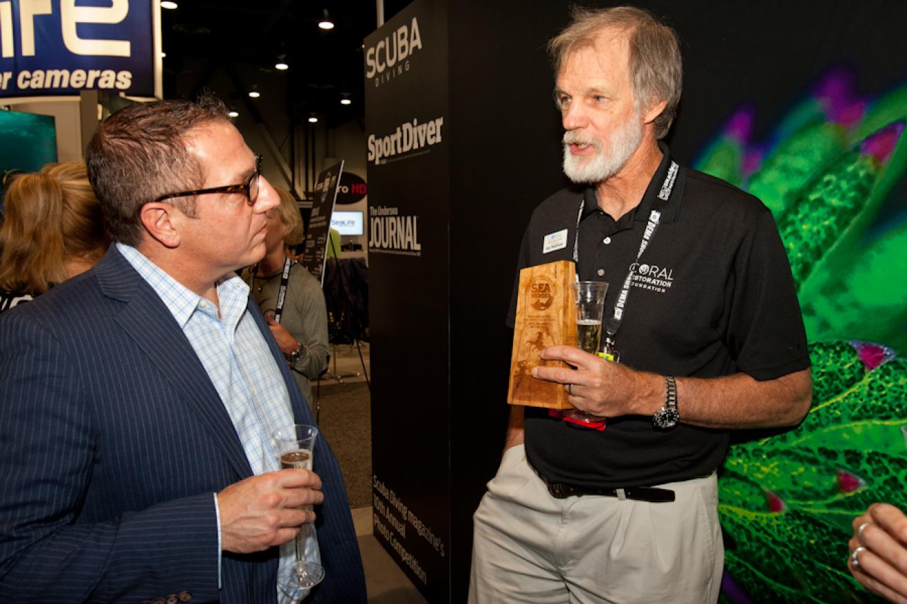 VJ Geronimo, left, Oris Watches CEO for North America, talks with Scuba Diving Magazine Sea Hero of the Year Ken Nedimyer, founder and president of the Coral Restoration Foundation, at the DEMA Show.