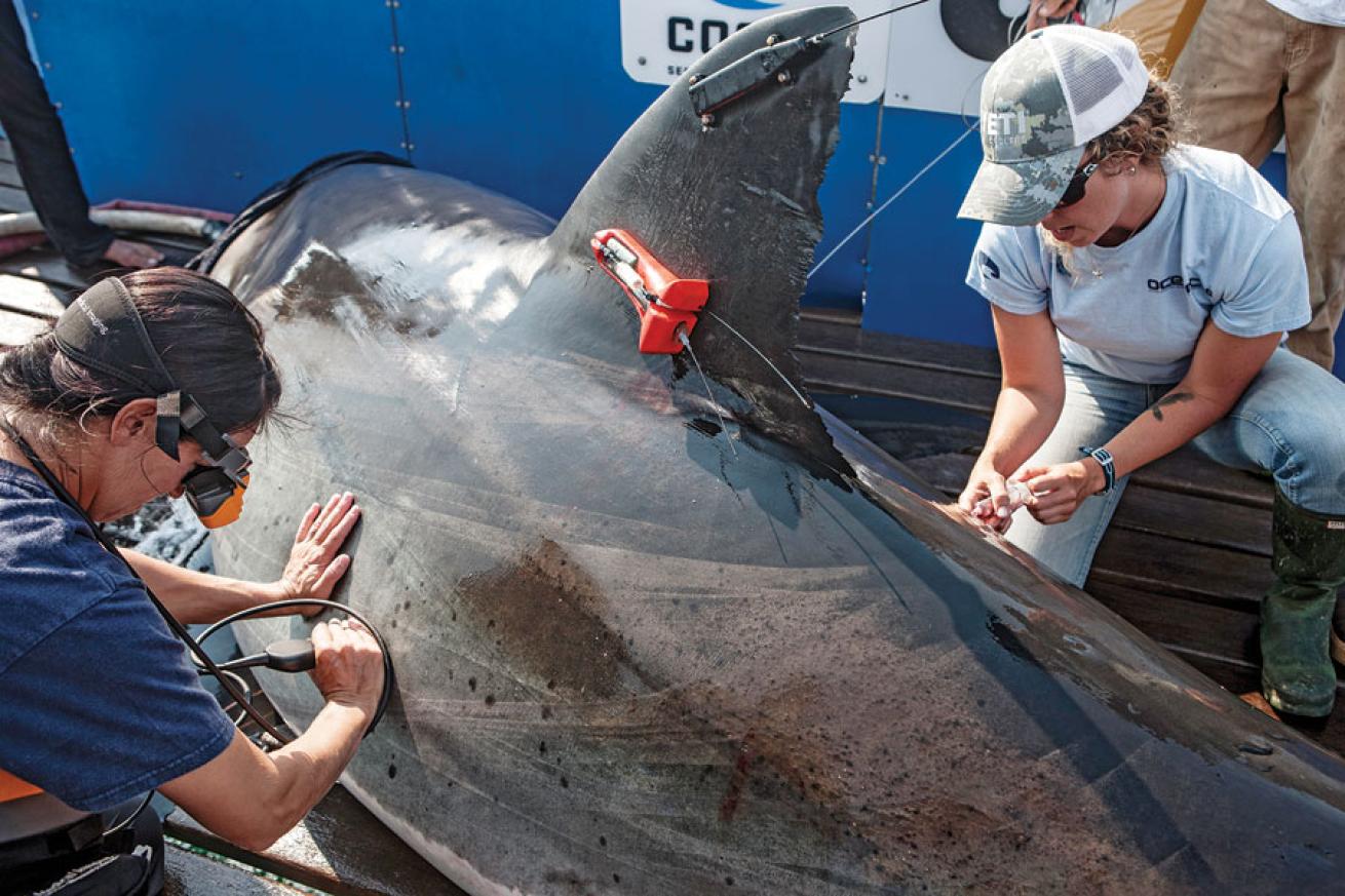 In addition to tracking movement, Ocearch scientists gather a number of blood and tissue samples, ultrasounds, and measurements of each tagged shark before it is released. These data are collected within 15 minutes, before the sharks are returned to the sea.