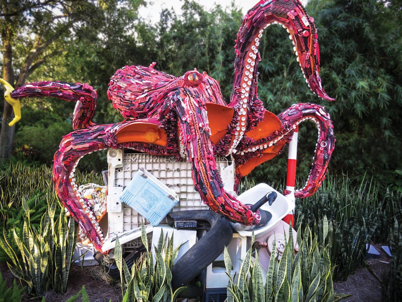An octopus sculpture made entirely of recycled marine debris was created by the Washed Ashore Project.