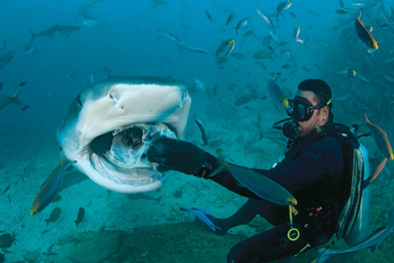 I’m a shark feeder for Aquatrek, and we work near the island of Beqa, close to Fiji’s largest island of Viti Levu. Three times each week, visiting divers kneel behind a rope on the bottom at 80 feet down to watch the sharks and me. We have eight species that come for the fish heads I hand out, including bulls, lemons and silvertips.