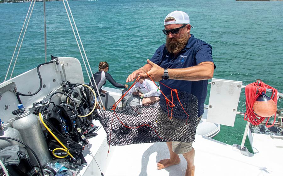 Divers aboard the Cat Pplau liveaboard become citizen scientists, helping the crew replant urchins to fight algal spread and repair the reefs of Exuma.