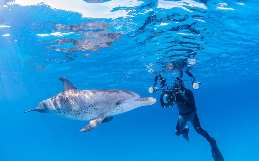 The young dolphin spent an entire dive dazzling divers in the Bahamas.