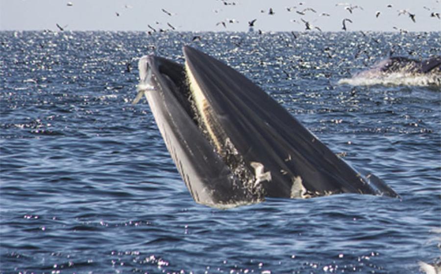 These baleen whales (*Balaenoptera brydei*) are closely related to blue and humpback whales.