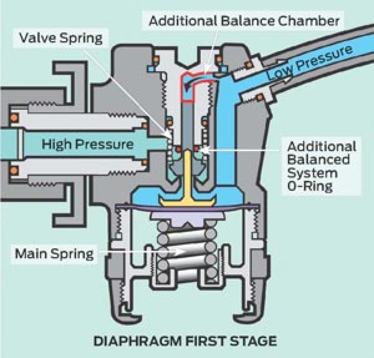In oversimplified terms, a typical second stage has at its heart a valve and a spring, much like the first stage. When a diver inhales on a regulator, the inhalation effort opens a valve that is closed by the tension of a spring. Balancing a second stage is accomplished by routing medium pressure air to the backside of the valve to help counteract the force of the spring. This allows the valve to open with less effort, making the reg breathe easier under heavier demand, such as the higher pressures at depth.