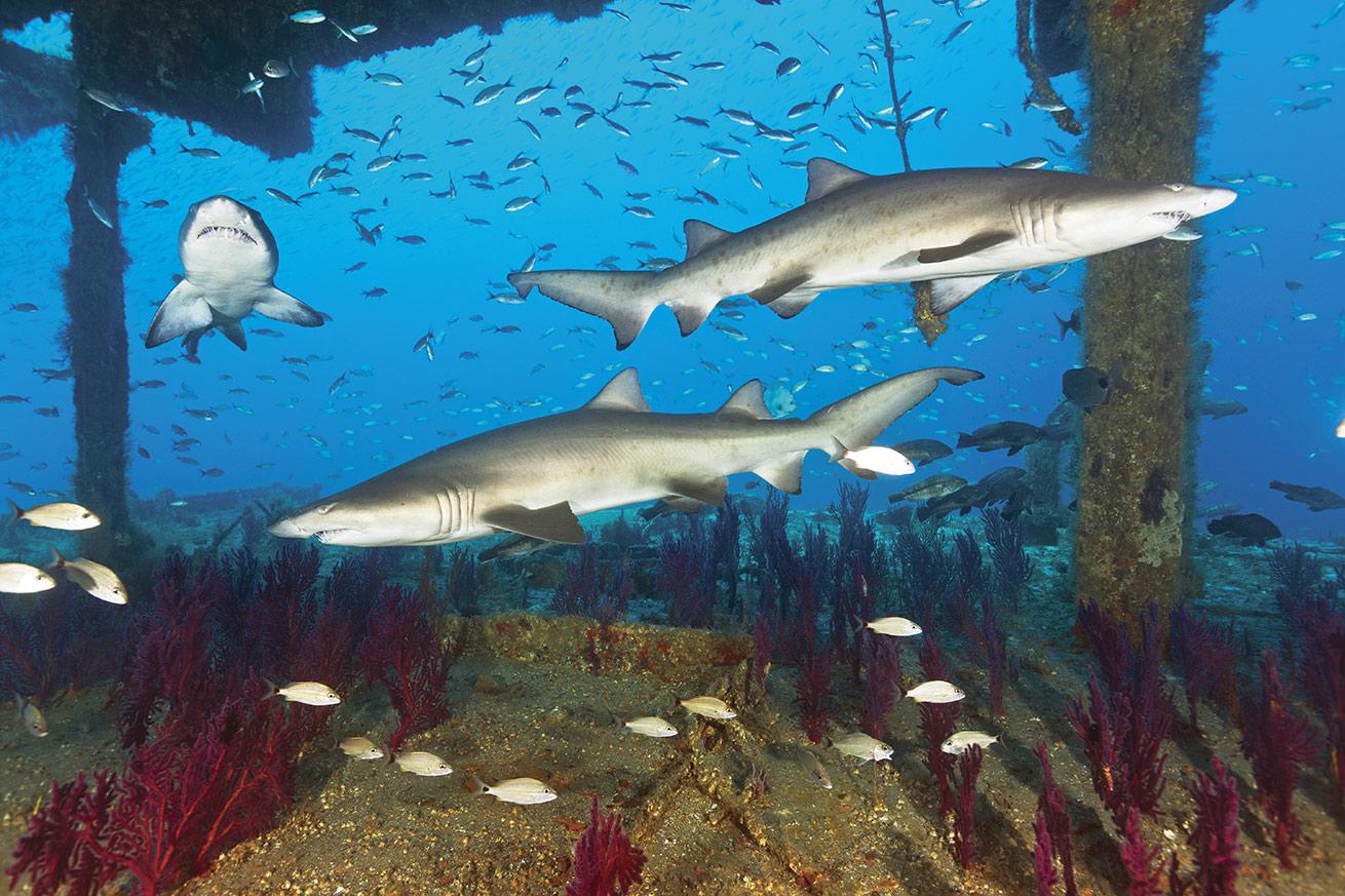 Divers primarily encounter female sand tigers, sometimes upward of 50 at a site. These sharks school, moving collectively between a handful of wrecks, most often the Caribsea, a 251-foot freighter 90 feet deep; the Aeolus, a 409-foot cable-laying ship sunk to 110 feet; and the 180-foot Spar, a cutter also purposely sunk to 110 feet.