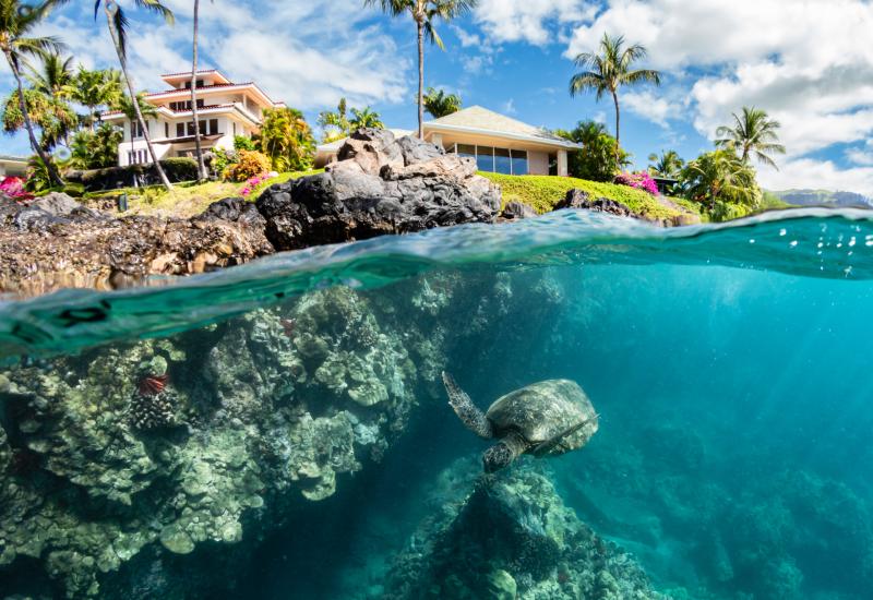 From here, it’s a gentle exploration, with sightings ranging from tiger morays to Hawaiian swimming crabs with their black-and-blue striped eyes. And, of course, green turtles are incredibly common.