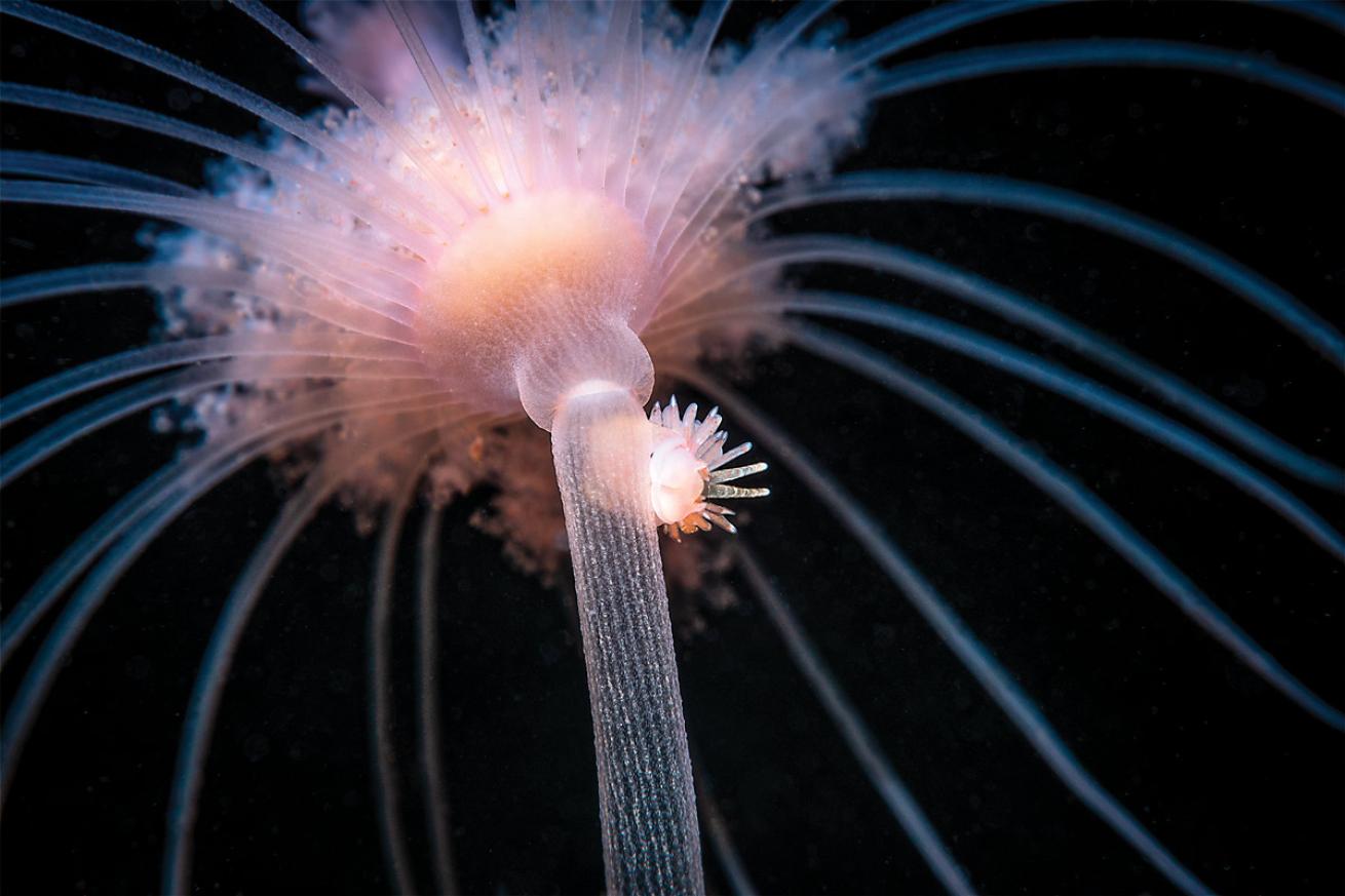 A feat of patience in the cold, surge-prone waters of Southern California, this photo captures a unique, captivating perspective of a fairypalm hydroid and nudibranch relationship.