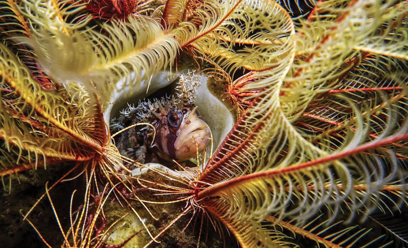 I found the swirling feather stars that frame this decorated warbonnet mirror the fish’s ornamental cirri in a pleasing, interesting way that really draws attention to the subject’s unique characteristics.