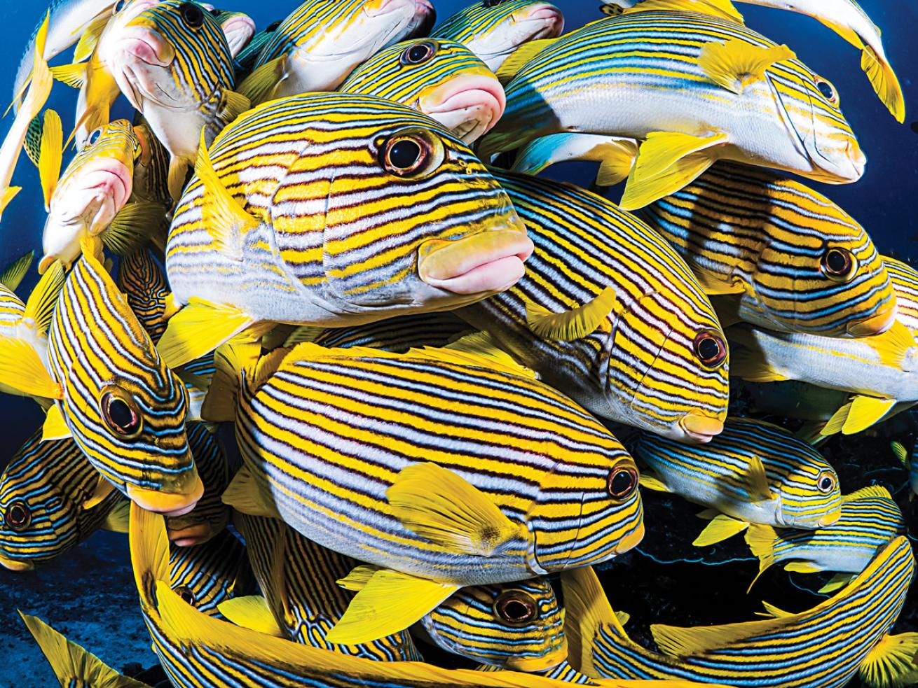 My favorite thing about being in the ocean is how you become completely immersed in your surroundings. This photo replicates that feeling. It makes me feel like I am a part of this school of sweetlips!