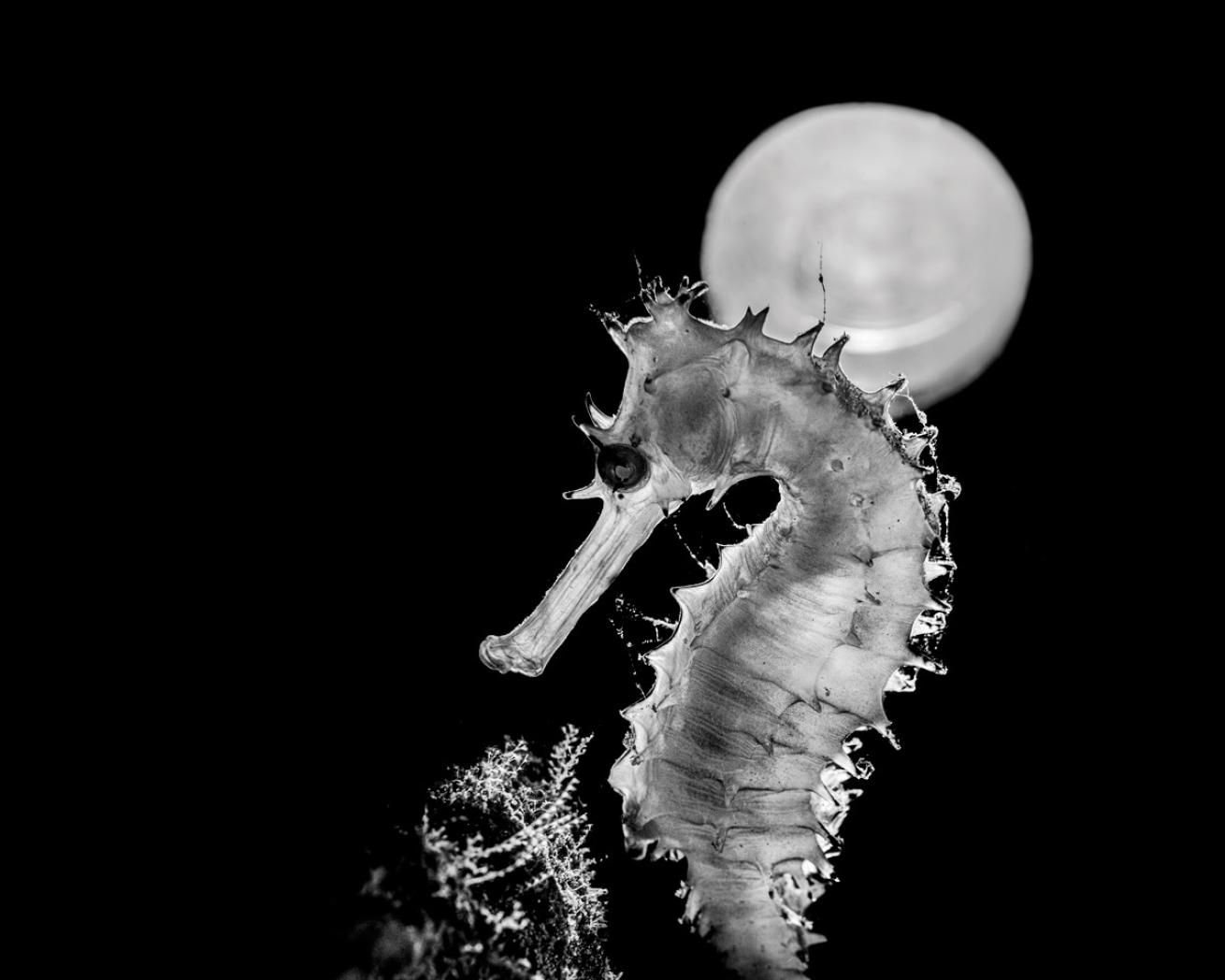 I was attracted to the ambience of this perfectly backlit image, and the position of the conceptual moon behind the spiny seahorse sets the mood.