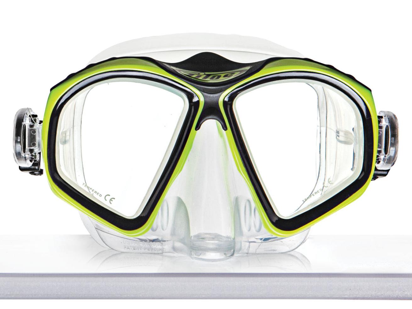 Chelsea PomalesThe new single-lens Synergy 2 has a unique double skirt; the inner skirt 1 (available in clear or black) is thin, soft silicone for a comfortable seal, and the shorter outer skirt is slightly thicker to provide support where it’s needed. It’s shown with the optional mirrored lens designed to relieve harsh glare.