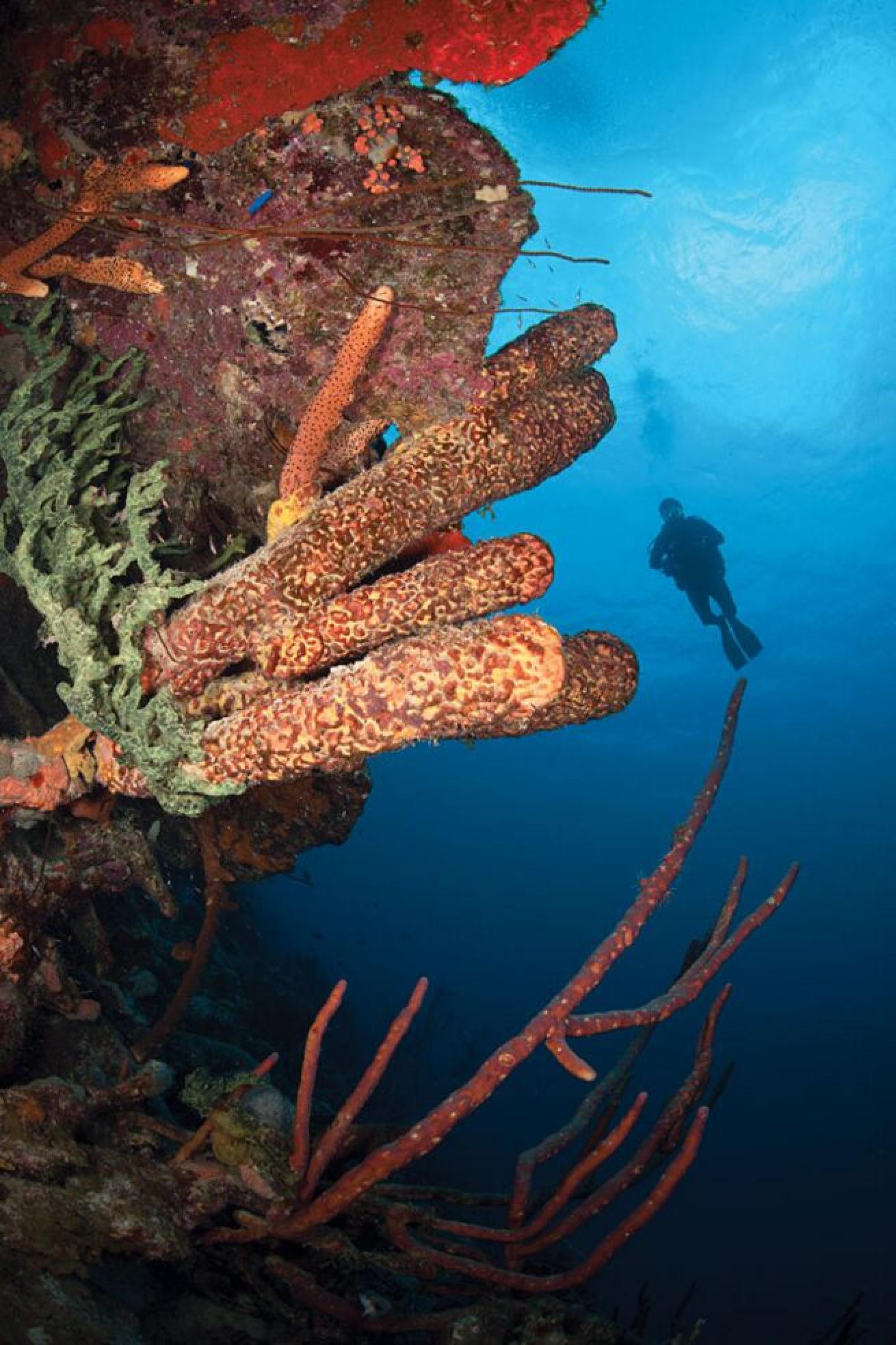 There’s no shortage of great dives at any depth on Bonaire, but most visitors to this shore-diving mecca will agree that one of the best deep reefs can be found at Karpata. Park at the iconic yellow-painted rock marking the site’s location, and from there, a short walk down a stairway leads to an easy entry and steep, sloping reef that quickly transitions into a near-vertical wall. Descend to around 100 feet for stunning views of the pristine reef towering above, sunlight streaming through the crystal-clear water, while parrotfish, triggerfish and snappers dance in the water column. Small caves dot the reef wall, so bring a light to look for moray eels and lobsters hiding in the recesses.