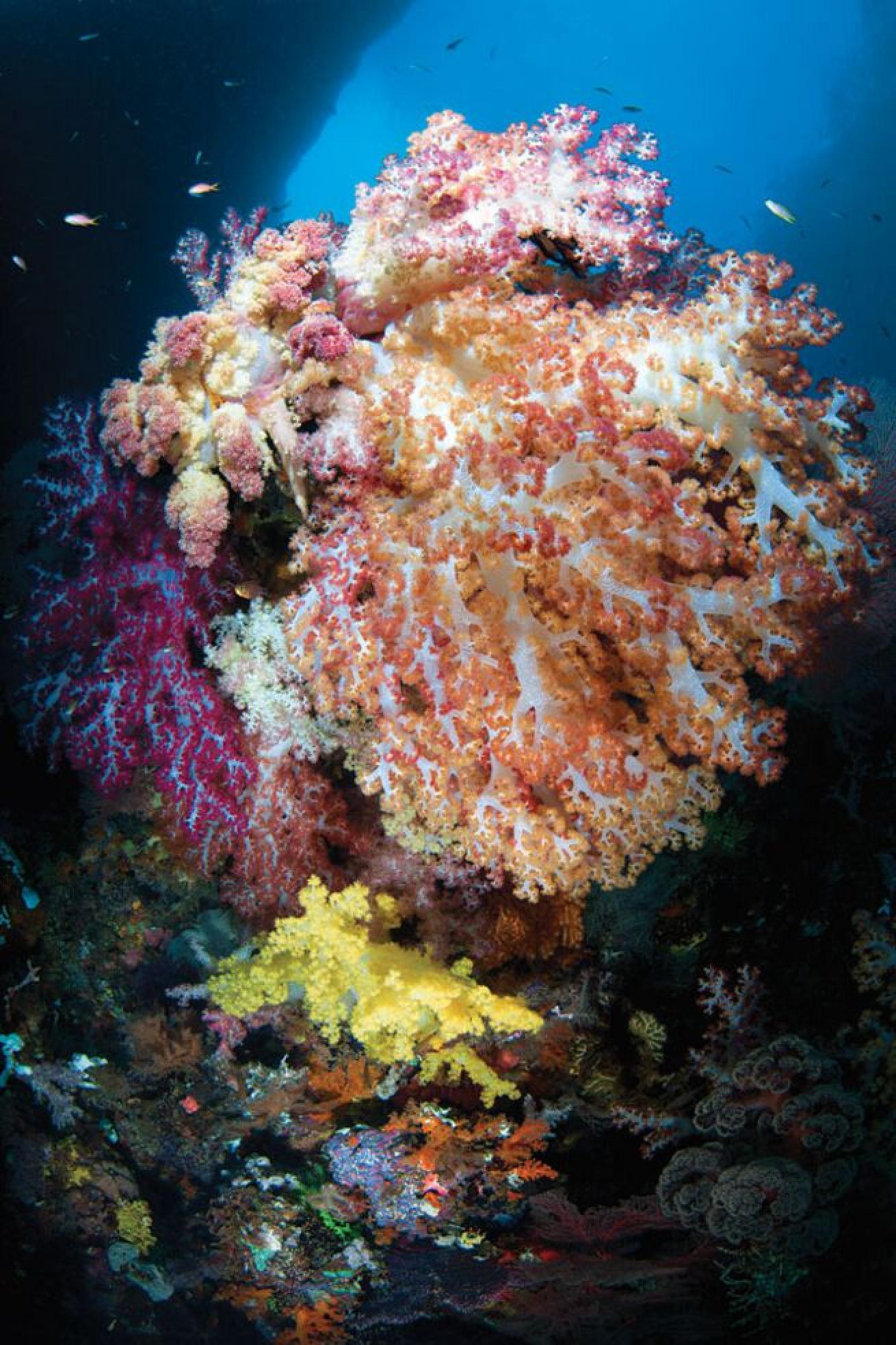 Named for the cylindrical kaleidoscopes that use mirrors and colorful glass beads to create beautiful patterns, the reef here has a magic all its own, carpeted with a dizzying array of soft corals and critters. Off the western tip of Papua, New Guinea, the Raja Ampat islands are a remote, 1,500-island chain in Indonesia where divers’ dreams come true. A hotbed of biodiversity at the heart of the Coral Triangle, Raja Ampat has something for every diver. At Kaleidoscope, that something is brightly colored creatures. Look closely at the pink gorgonian fronds to spot fingernail-size pygmy seahorses, or enlist your divemaster’s help in finding rare nudibranchs, rhinopias and ornate ghost pipefish. While Kaleidoscope is primarily a small-critter dive, it’s not uncommon to spot blacktip reef sharks or mobula rays finning their way across the reef.