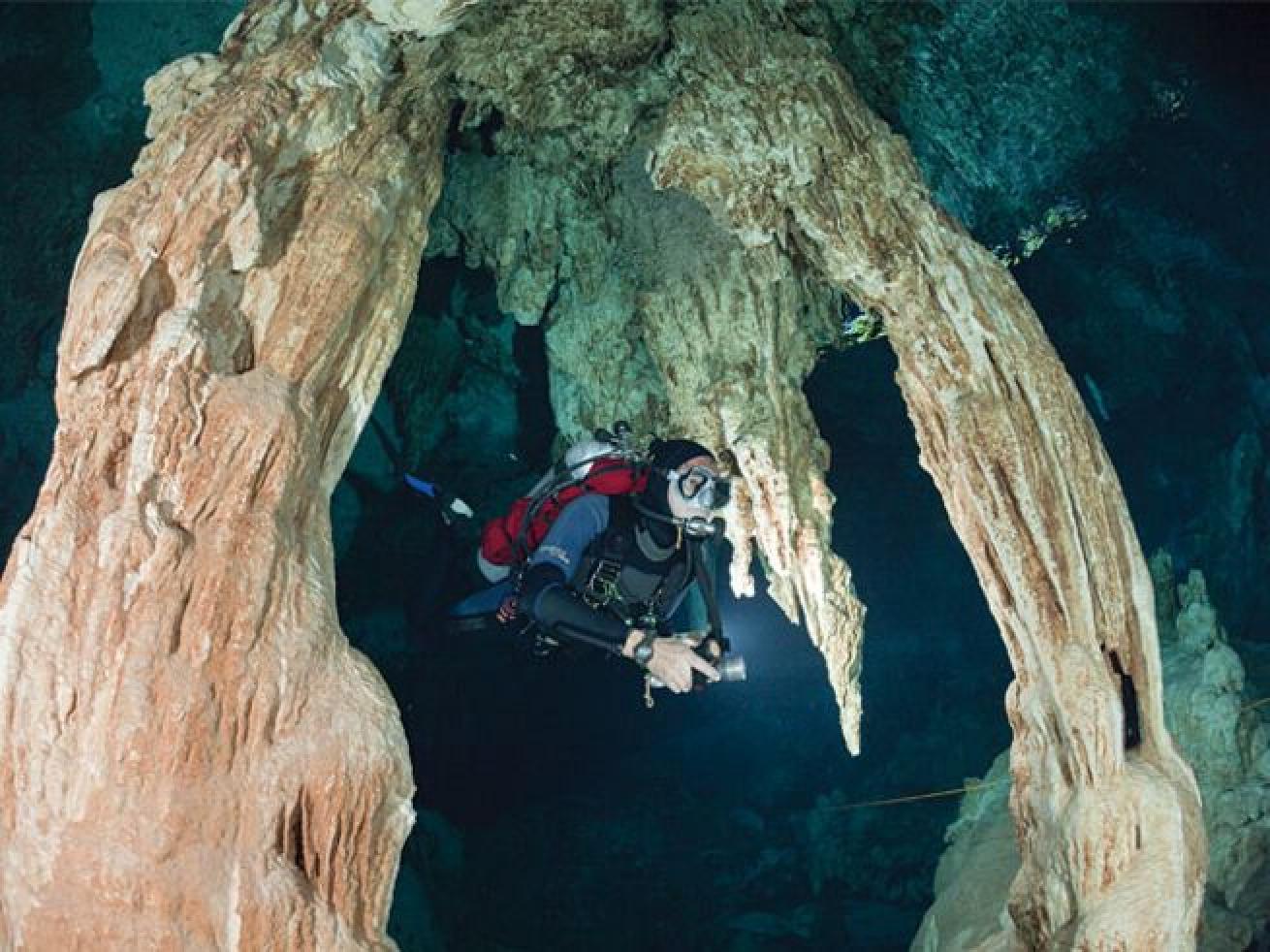 The Maya believed that cenotes were the entrance to Xibalba, the Mayan underworld, but divers know that the freshwater sinkholes of Mexico’s Yucatan Peninsula are doorways to the largest subterranean-river system in the world. From the mouth of the cavern at Dos Ojos, divers can follow two lines. The Barbie Line to the right follows a well-lit path into the jagged mouth of the second opening, where towering stalactites hang like teeth in a gaping mouth. To the left, the Bat Cave Line follows a side branch, a darkened tunnel filled with delicate soda-straw formations leading to a massive chamber half-filled with air, the ceiling hung with clusters of small bats.