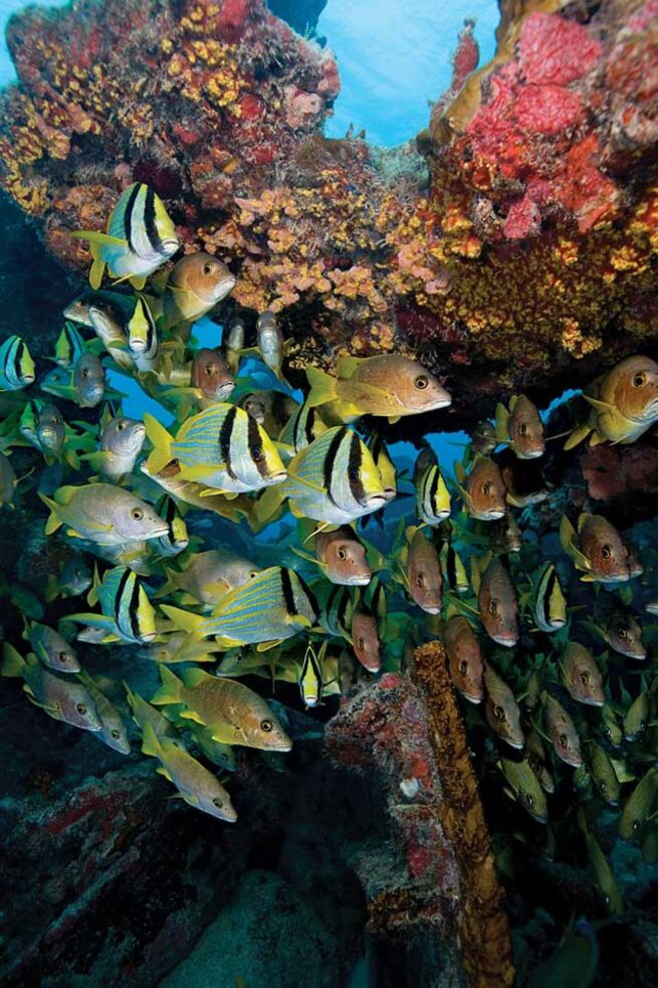 When most divers think of wreck diving in the Florida Keys, their minds immediately go to massive artificial reefs like the Spiegel Grove and Vandenberg, but in fact, one of the most popular Keys wrecks sits no deeper than 50 feet. The Benwood was a merchant-marine freighter that sank in a collision in 1942, and more than 70 years on the seafloor has made it a veritable reef in its own right; today it is caked in corals, frosted by vast forests of Christmas tree worms, and home to an incredible population of reef fish. Snapper, goatfish and grunts pack the holds, while queen angelfish and trumpetfish hover along the superstructure. Return at night to see the ship in a whole new light, with lobsters and green morays cruising the open decks.