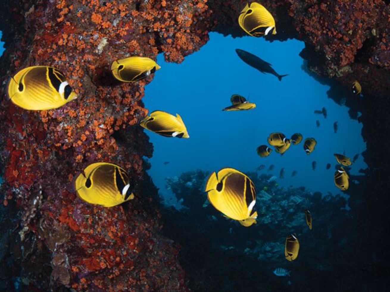 Divers say it’s a religious experience, and that First Cathedral — one of Maui County’s most picturesque dives — is aptly named. Follow the mooring line to the foot of an undersea pinnacle, a massive rock dome created from a bubble of ancient lava. The entrance appears like a mere crack in the wall, but fin through the fissure and the room opens before you. Once inside, the “cathedral” part of the name becomes apparent. Roughly cross-shaped with a long aisle and two arms, a hole in the ceiling over the center point sends shafts of light onto a massive boulder, illuminating it like a stained-glass window in a church sanctuary. Take the left arm to the floor- level exit, nicknamed the Champagne Cork, where you can time your fin kicks with the ocean’s surge to soar onto the outside reef.