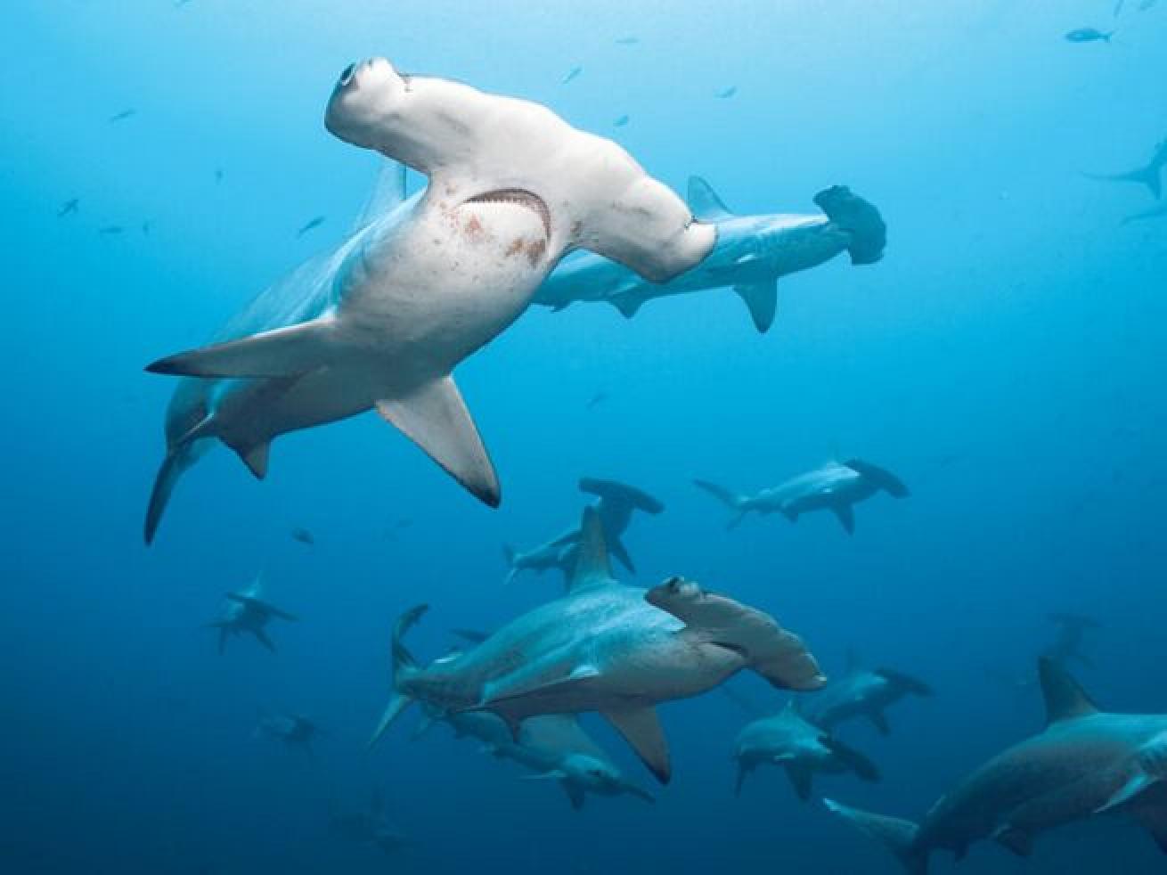 Remote and wild — home to ripping currents, steep walls, crazy-big schools of pelagic fish, and packs of sharks — Wolf Island is the pinnacle of Galapagos diving. Drop down to an ideal depth of 70 feet, and just sit back and enjoy the show: Galapagos sharks prowl the seas, whitetips writhe and flow from cracks and crevices in the rocks, and out in the blue water, a never-ending swarm of scalloped hammerheads — gorgeously silhouetted by the sun — slowly swirl the island like moths around a giant flame.
