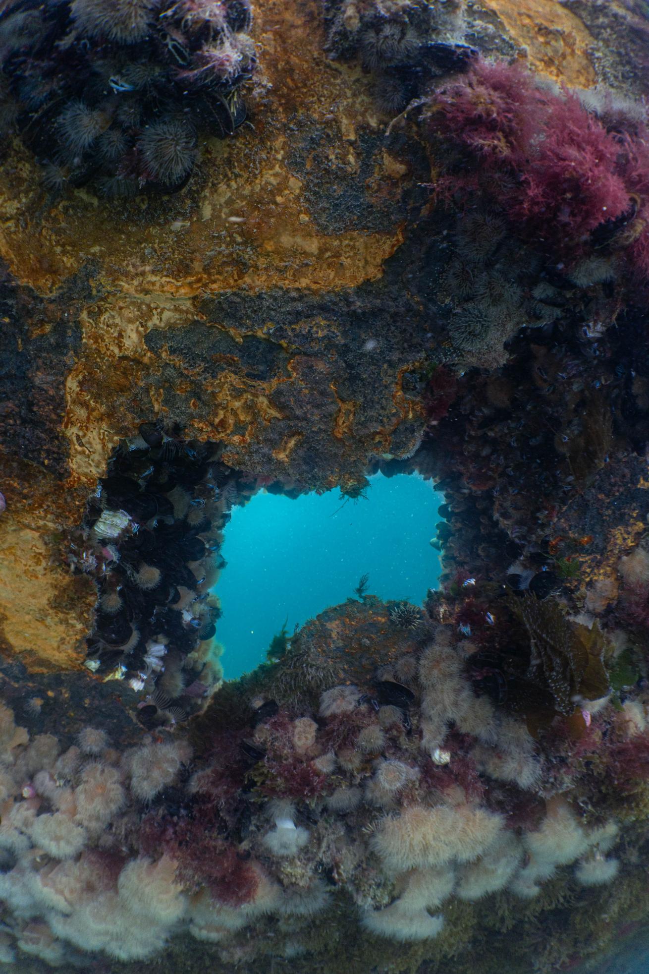 Diving into the frigid waters of Patagonia has its own mystique. The cold seems to freeze your brain, leading you to connect solely with the present; continuously refreshing your thoughts. As you descend in your accumulated 10mm of neoprene and diving gear, the weight fades away, the hood and gloves become your best allies, and you completely forget that you're diving in waters of just 60 degrees Fahrenheit. You bask in a scene of sea stars, mussels, algae, corals and little fish that surround and decorate a sunken ship, turning it into a work of art.
