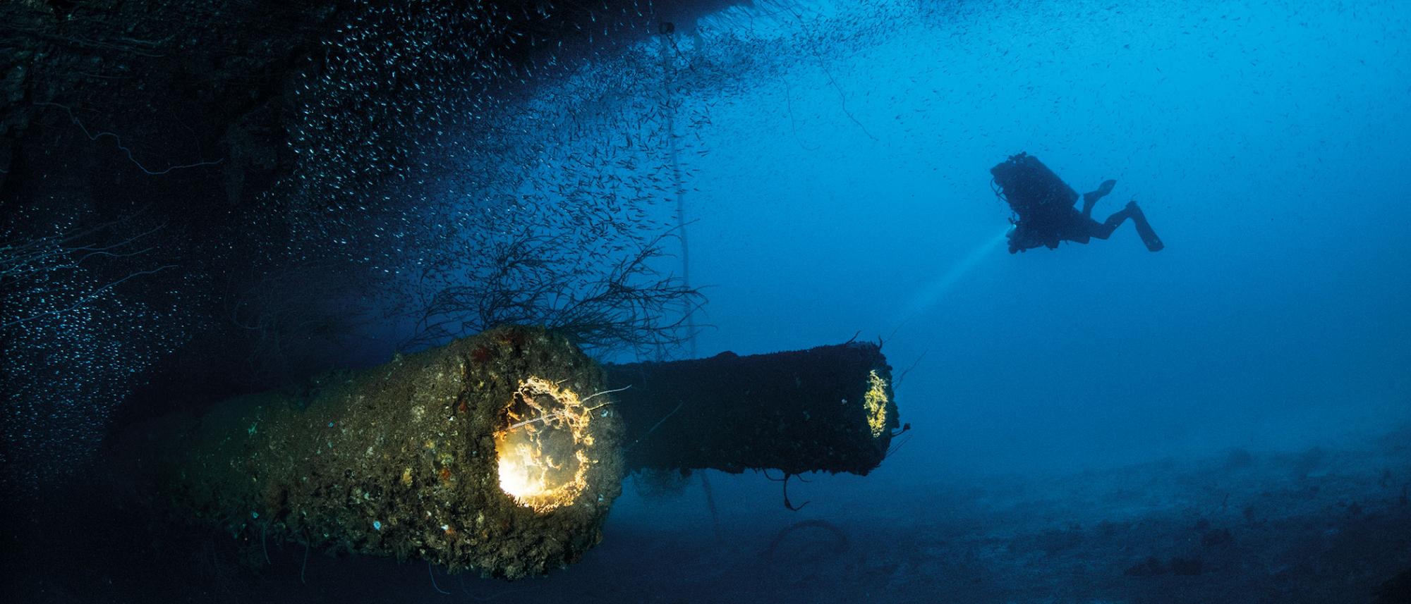 Other wrecks in the atoll are also packed with equipment. The 708-foot HIJMS Nagato, superbattleship and pride of the Japanese navy, rests upside down on the turrets of its eight massive 16-inch guns. Admiral Isoroku Yamamoto famously gave the command to attack Pearl Harbor from this ship in 1941. Today the bridge where Pearl Harbor’s fate was decided has broken off and is lying next to the overturned hull. Its four huge props stick out like windmills, surrounded by clouds of glassfish.